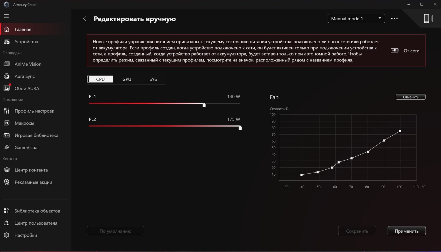 Производительность системы и эффективность охлаждения можно настраивать в пользовательских профилях.
