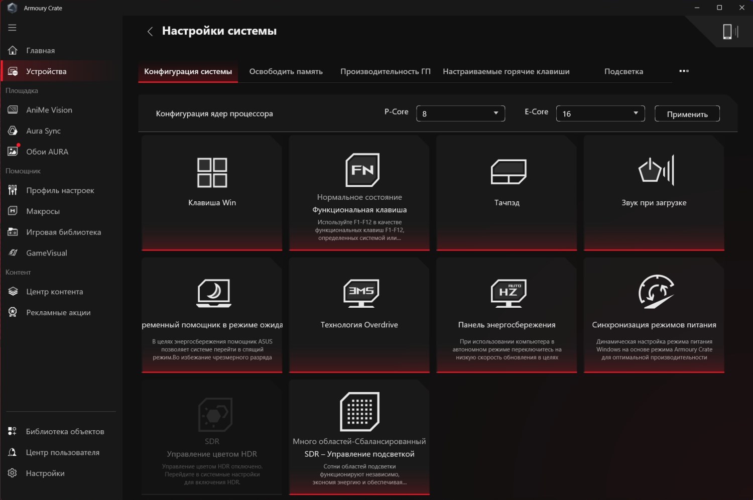 Ноутбук поставляется с предустановленной лицензионной копией операционной системы Microsoft Windows 11. Перед использованием рекомендуется обновить всё через центр обновлений, благо там обновляется даже прошивка устройства. Есть знакомая утилита Armoury Crate.