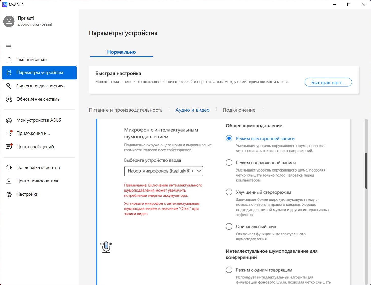 Для быстрого переключения между профилями настроек удобно использовать сочетания горячих клавиш. Как и в других ноутбуках производителя, ещё есть приложение MyASUS.