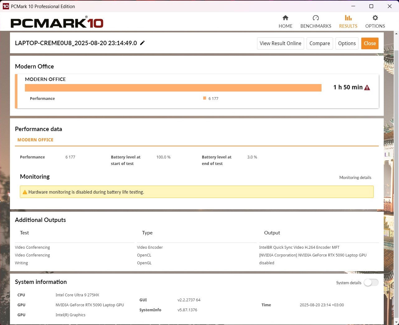 Играть от аккумулятора долго не получится. Тестовый пакет PCMark с предустановкой Gaming работает 1 час и 14 минут. Зато тест Modern Office, который эмулирует работу в офисных приложениях, демонстрирует практически 2 часа. В режиме экономии энергии это время можно увеличить более чем в два раза.