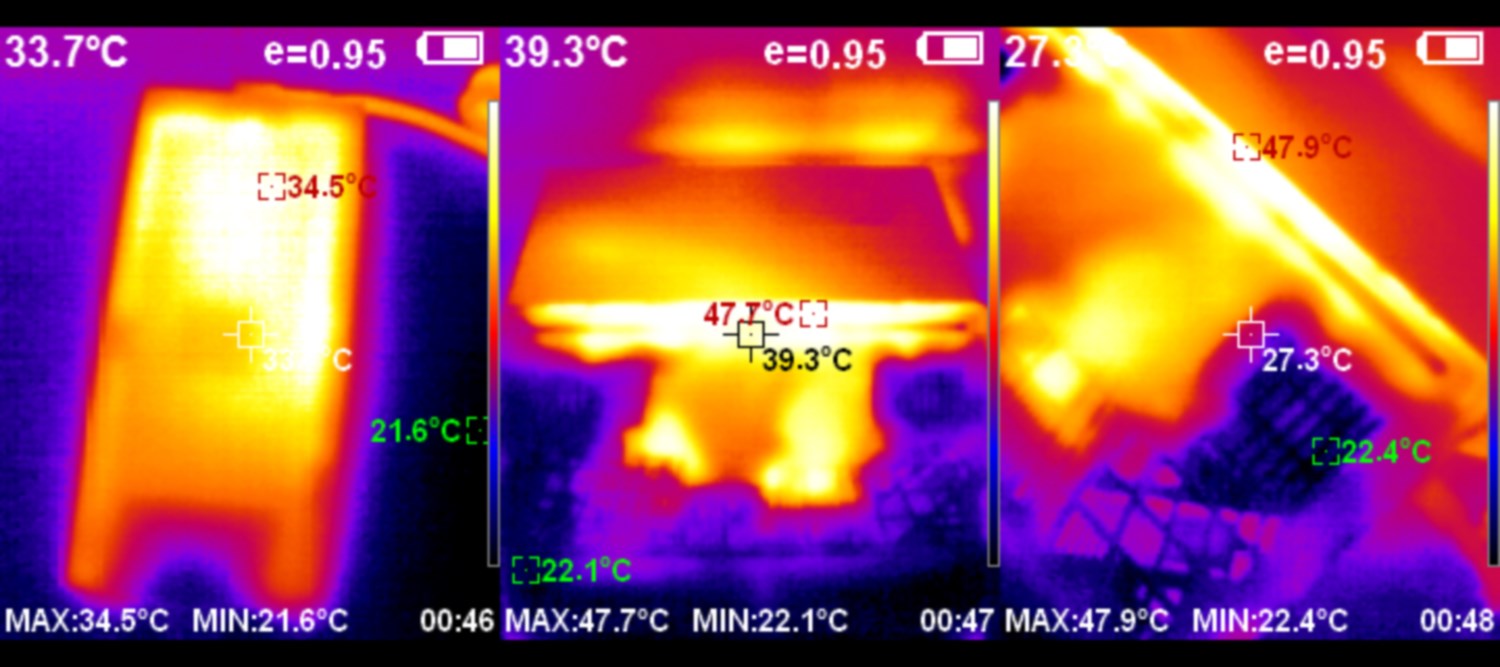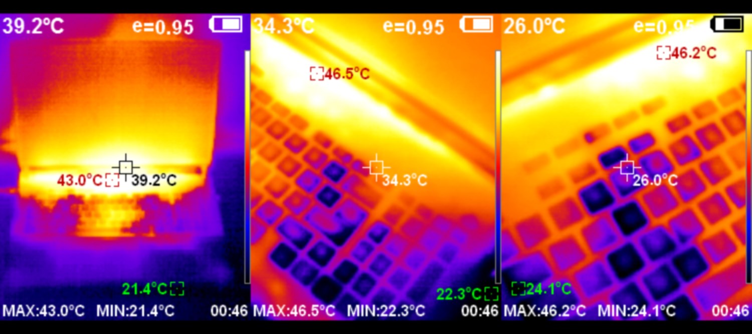 Нагрев устройства достаточно умеренный. При использовании самых тяжёлых приложений (Prime95, Furmark и OCCT в режиме Power) температура клавиатуры не поднимается выше 35°C. Нагрев неравномерный, основная часть горячего воздуха выходит сзади.