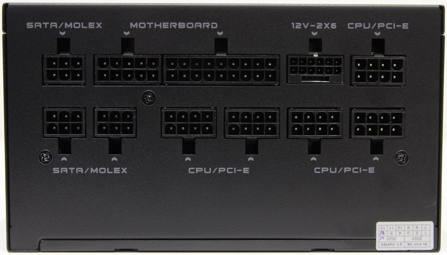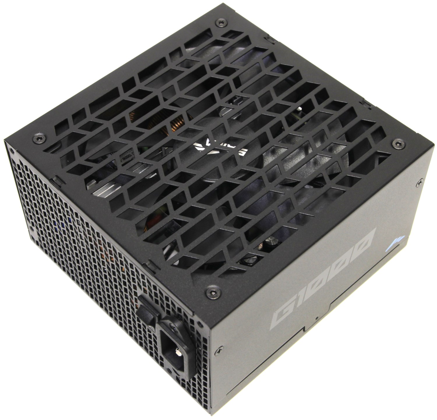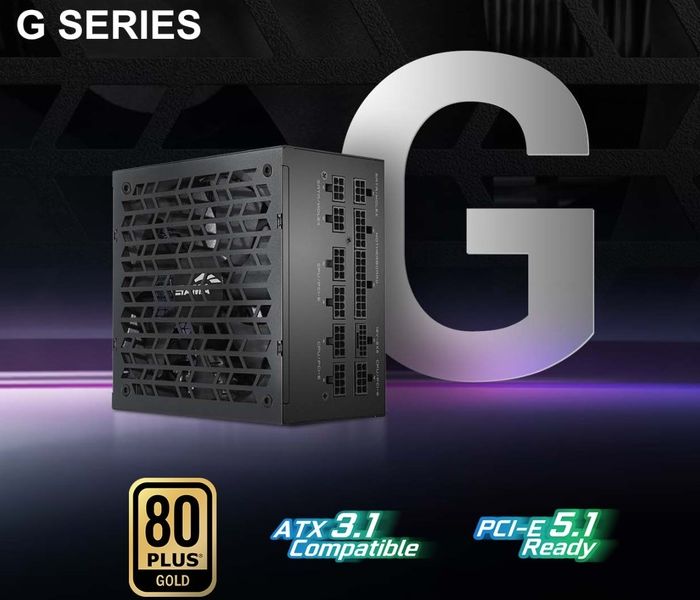 В левом нижнем углу указано наименование модели G1000. Название простое и понятное. В правой части есть группа значков, которые сообщают нам часть информации о данном блоке. Например, указан сертификат 80 Plus Gold. Также сообщается о соответствии стандарту ATX 3.1 с поддержкой разъёма 12V-2x6 (12VHPWR). Тут же сразу нам сообщают о пятилетней гарантии.