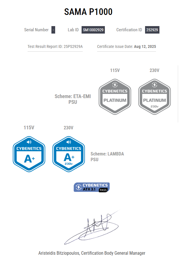 Новые компании, которые появляются на рынке, обращаются к крупным OEM-производителям и те уже подсказывают им решения. Одной из таких является фирма SAMA. Она с двух ног врывается в бой и выдаёт на-гора сразу несколько различных моделей с сертификатами 80+ Gold и 80+ Platinum (причем P1000 и P1200 прошли сертификацию Cybernetics), а помогает ей в этом RSY. Это OEM-производитель платформ для блоков питания.