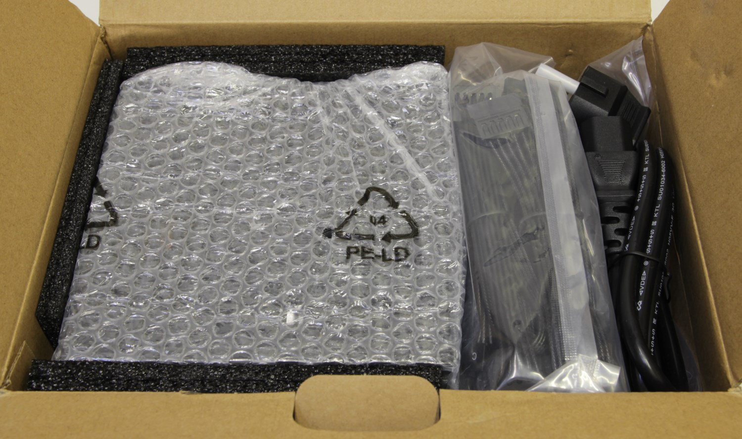 После вскрытия коробки выясняется, что блок питания и комплект поставки хорошо и надёжно упакованы. Также известно, что кабели блока питания съёмные. Изначально все они покоятся в отдельном прозрачном пакете.