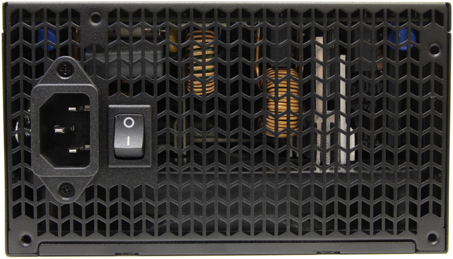 Сзади устройства предусмотрены привычные вентиляционные отверстия. Можно было бы ожидать кнопку или переключатель для гибридного режима работы. Однако в данном блоке он работает в базовом режиме, и принудительно включить вентилятор тут не получится без внесения изменений в конструкцию. При достижении потребления на уровне 40% от максимальной мощности вентилятор включается и начинает работать на частоте приблизительно 800 об/мин.
