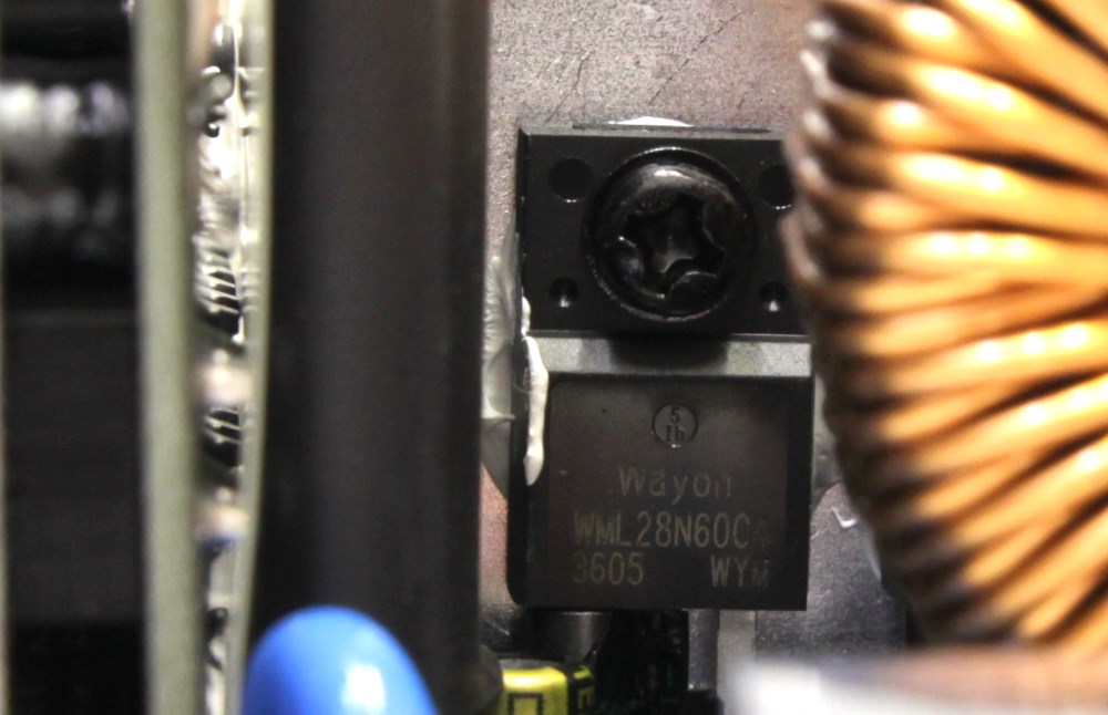 APFC реализован при помощи контроллера Texas Instrument UCC28180, двух мосфетов Way-On WML28N60C4 на 600 В, 13 А и одного диода Шоттки DSC10A065 на 650 В, 10 А. Эти три микросхемы смонтированы на одном крупном радиаторе. На нём же находится мостовой выпрямитель. Среди прочих элементов можно заметить четыре основных МОП-транзистора Shenzhen SI SIF26N50F. Резонансный LLC-преобразователь представлен контроллером Texas Instrument UCC25600.
