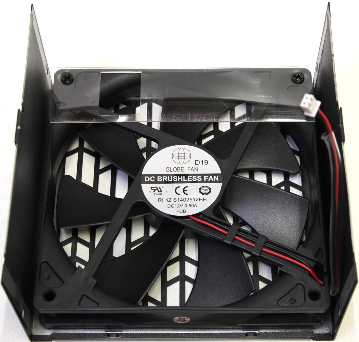 Вентилятор размера 140 х 140 мм производства компании Globe FAN модель S1402512HH. Он оборудован гидродинамическим подшипником, максимальная скорость составляет 1800 об/мин. Подключается через коннектор, а не припаян на прямую к плате, что облегчает обслуживание.