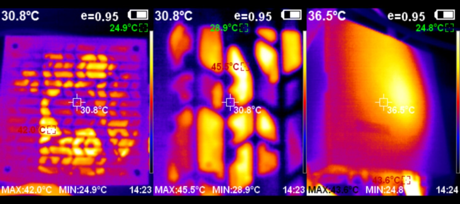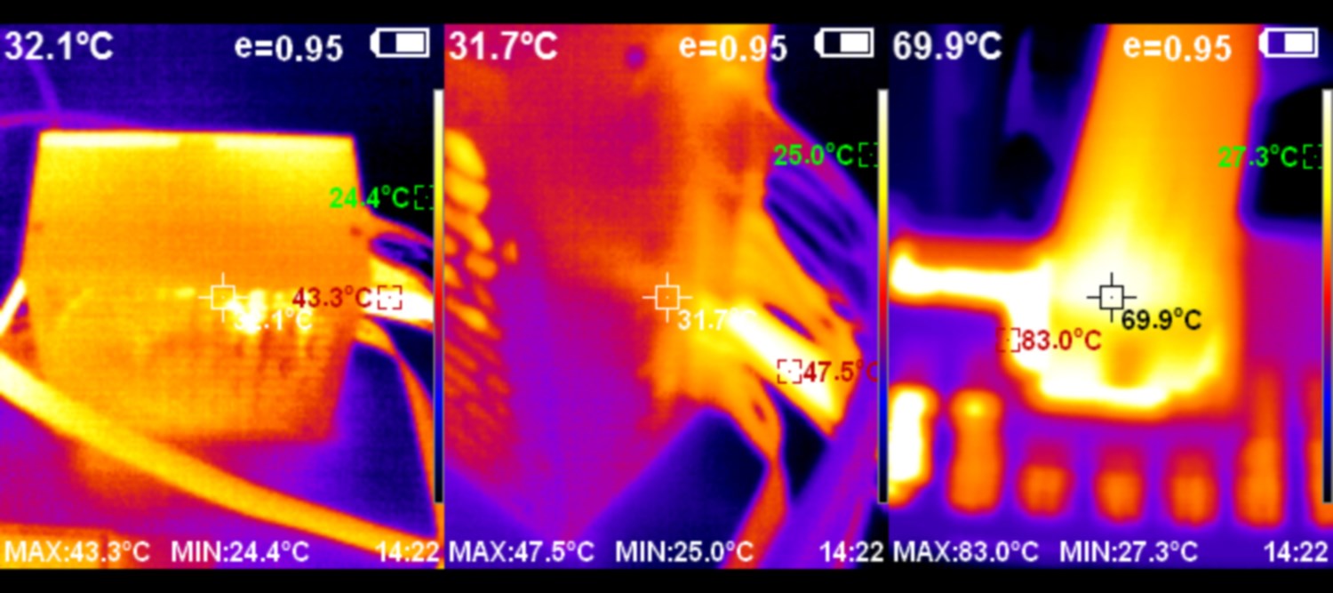 Тепловизор показывает, что блок питания в нагрузке греется не так сильно. Это объясняется тем, что диапазона скоростей вентилятора хватает для различных условий. Шум на минимальной скорости 800 об/мин с расстояния 30 см составляет 28.5 дБ, что реально очень тихо.