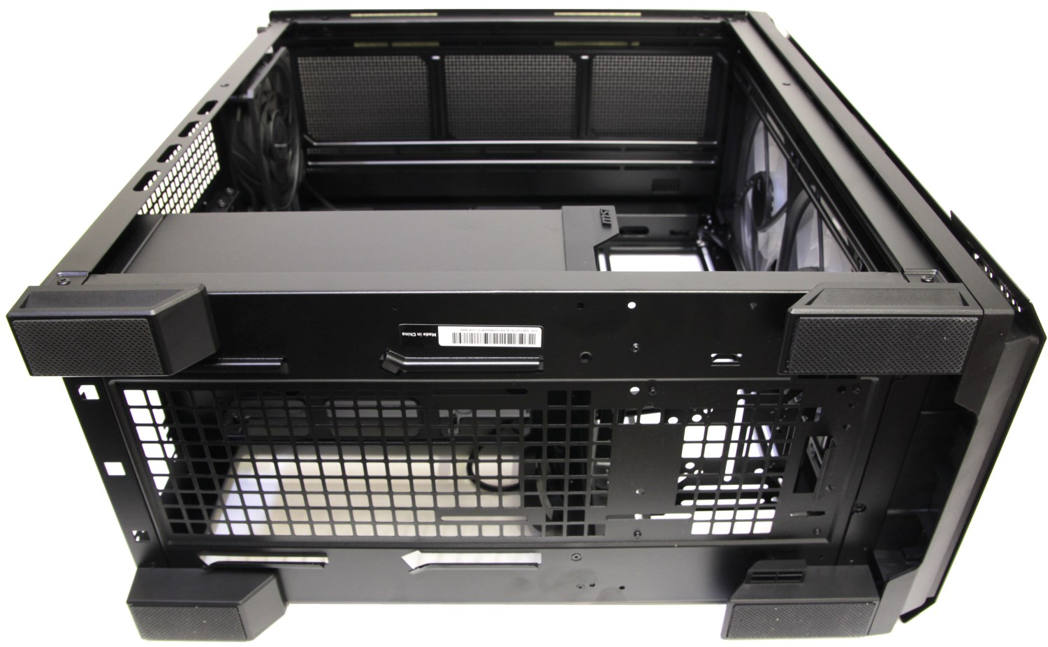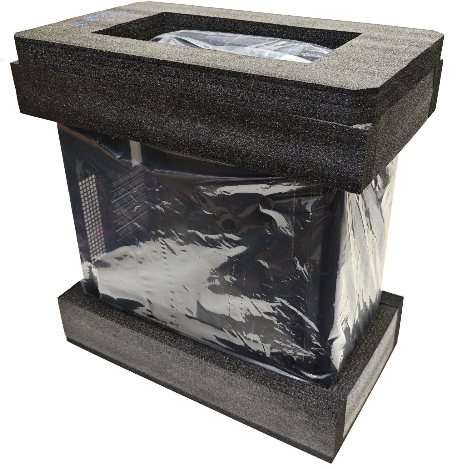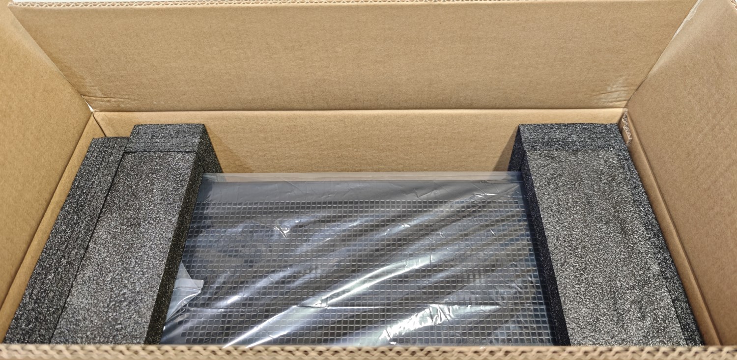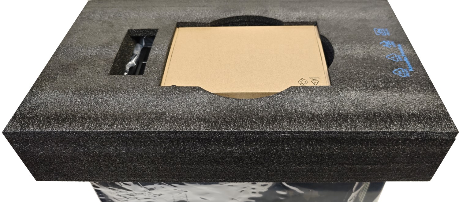 Открыв коробку, я обнаружил, что корпус расположен передней панелью вверх. На этот раз вместо пенопласта используется каркас из чёрного вспененного полиэтилена.