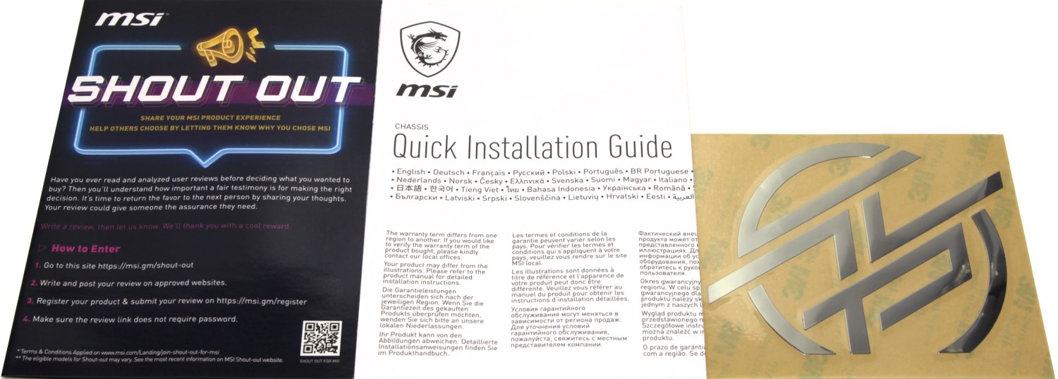Внутри можно обнаружить инструкцию по монтажу, информационный буклет и крупную зеркальную наклейку в форме логотипа серии MSI MPG.