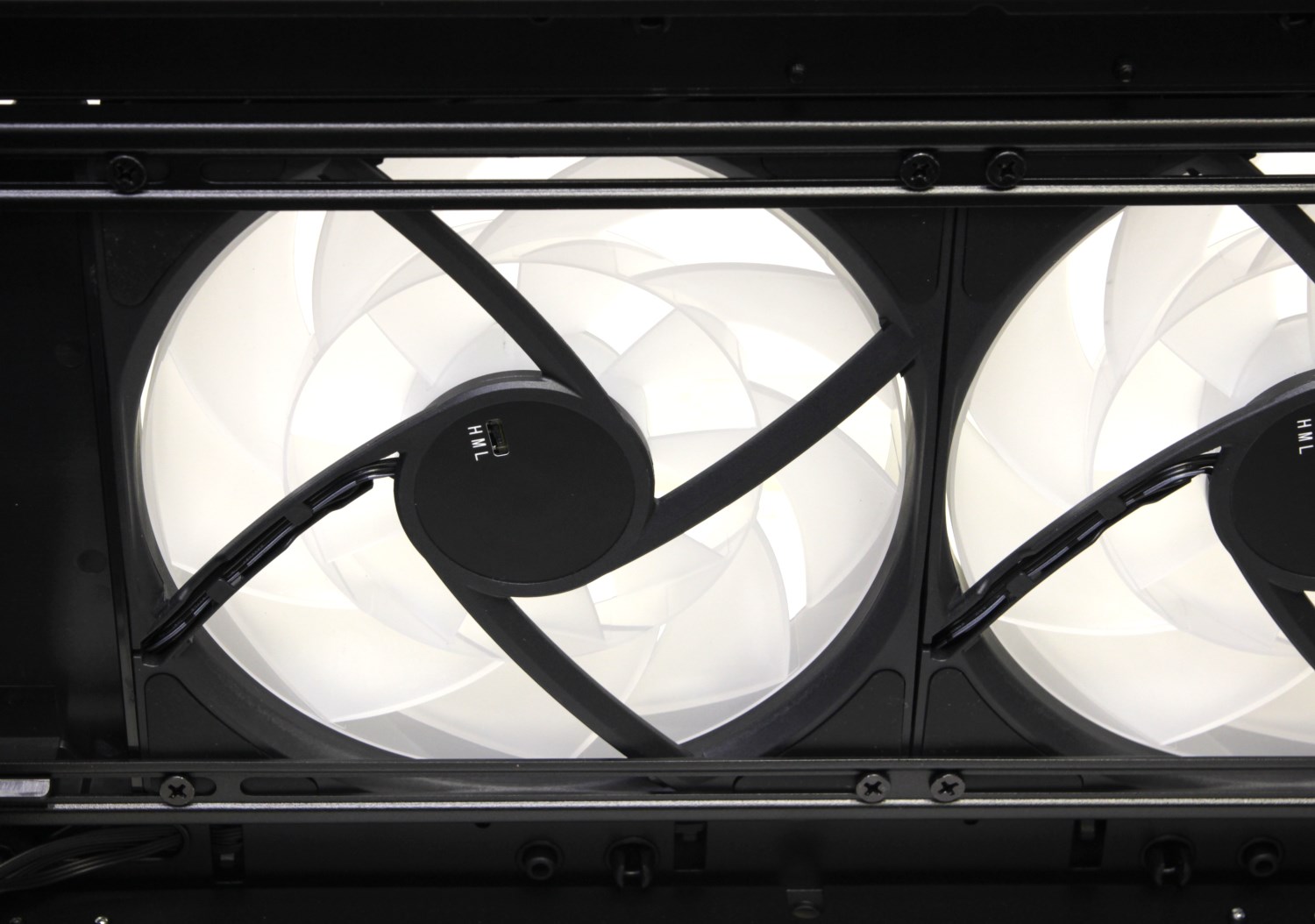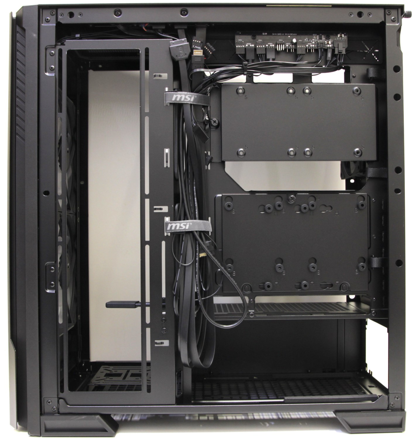 Все три вентилятора изначально подключены к специальному хабу, который скрывается за правой стенкой и размещается в верхней части, недалеко от разъёмов и кнопок.