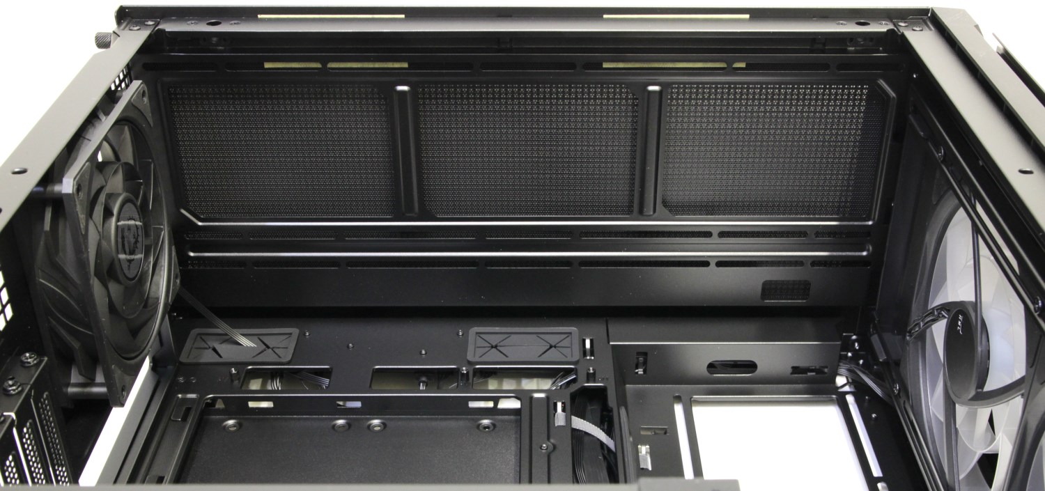 Хорошо реализована система фильтрации от пыли. Все фильтры легко снимаются и обслуживаются. У двух передних вентиляторов размера 160 мм можно выбрать один из трёх режимов работы при помощи переключателя, который расположен с обратной стороны двигателя. Корпус большой просторный и достаточно универсальный потому, что в нём можно разместить плату более крупного формата – E-ATX.