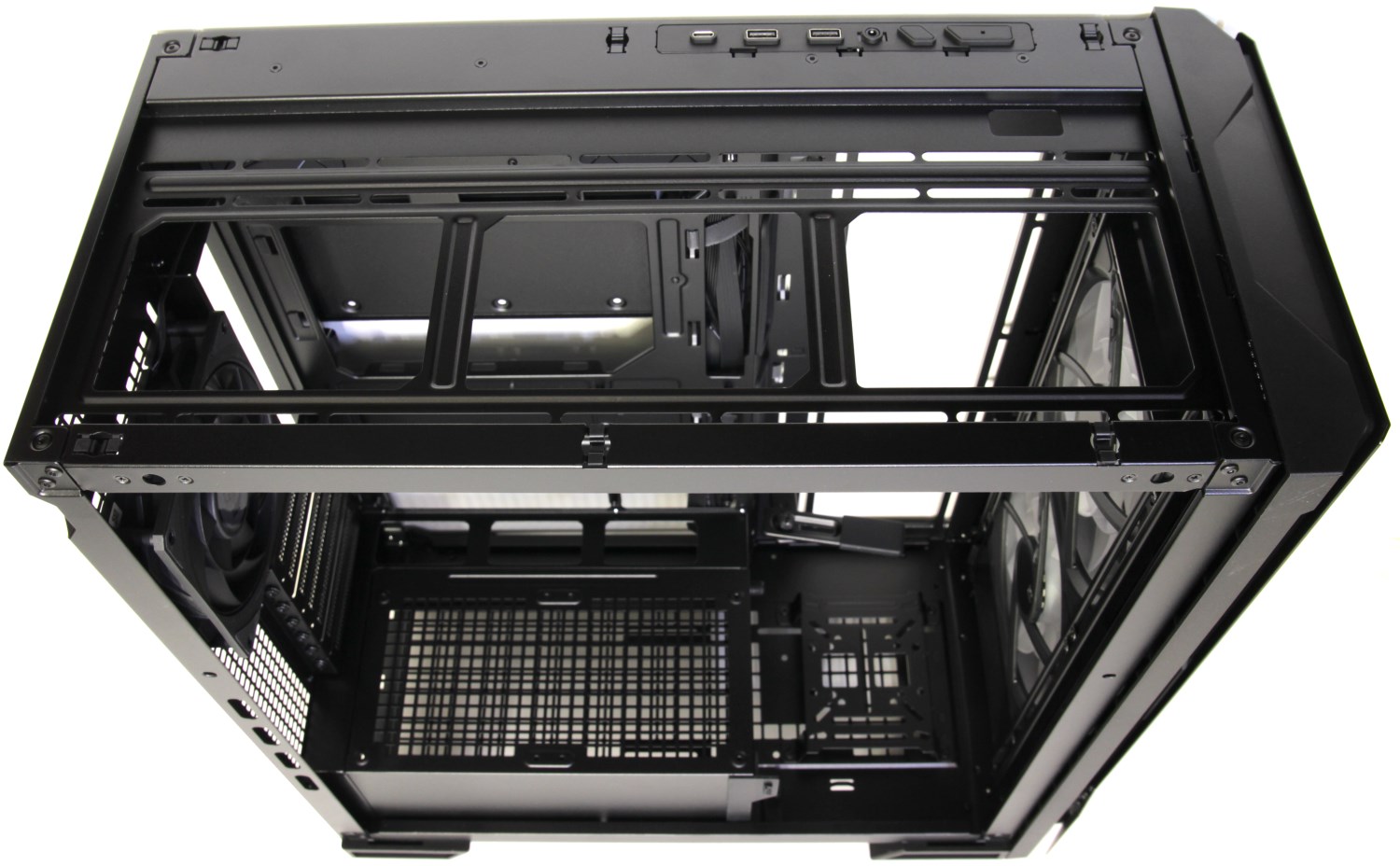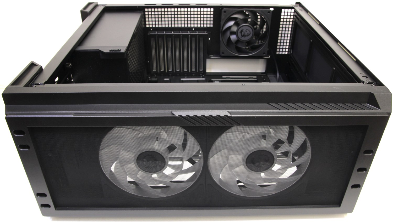 Данный корпус не подразумевает установку AIO спереди. Вместо этого её можно поставить сверху или на внутренней перегородке, для чего есть специальные рамки крепления с отверстиями.