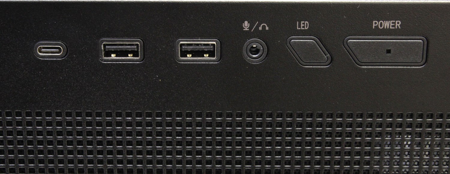 Есть кнопки Power, переключатель режимов подсветки, а из разъёмов присутствуют два USB 3.0 Type-A, один USB 3.0 Gen2 Type-C. Индикатор питания встроен в кнопку включения. Ещё здесь можно заметить один разъём миниджек для подключения гарнитуры. Каждая кнопка и разъём обрамлены пластиком, чтобы напрямую не касаться верхней металлической панели, а точнее прорезей в ней.