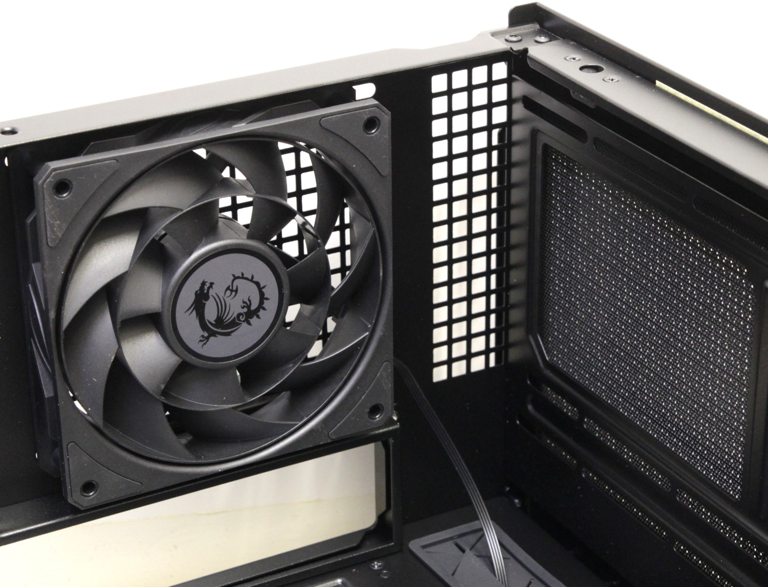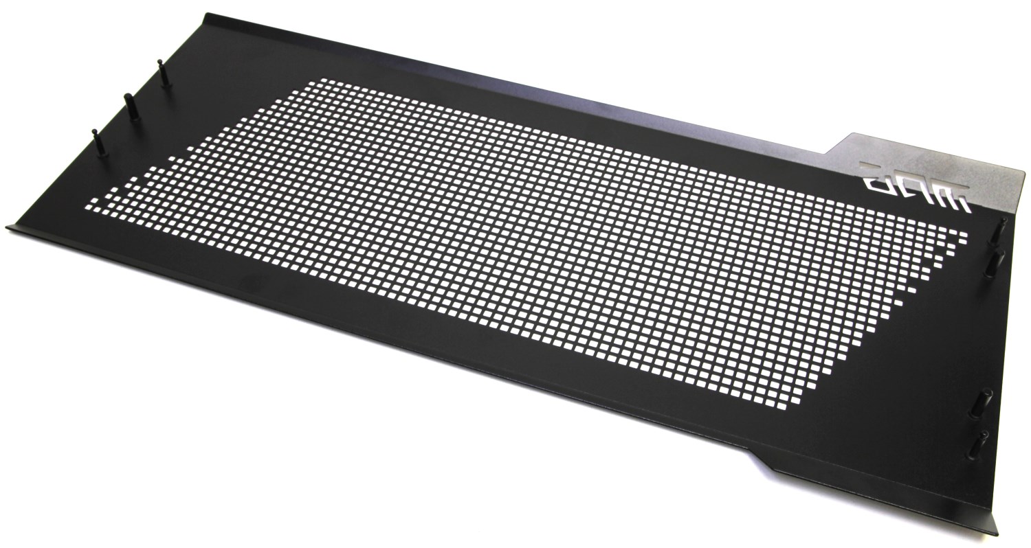 Надёжно ли приклеены эти стальные планки? Да, очень даже хорошо. Мне такой вариант открытия и фиксации боковых панелей понравился. Правая стальная стенка крепится аналогично. На ней, как и на передней, можно заметить полосы с крупной перфорацией, а чтобы пыль не проникала, предусмотрена специальная сетка на магнитной полоске, спрятанная внутри.