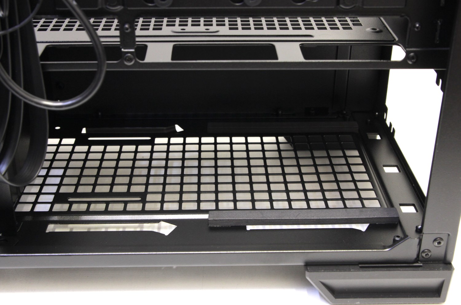 Вертикальной установки видеокарт не предусмотрено, поэтому никаких дополнительных устройств для этого нет. Вместо этого внутри есть специальная поддерживающая штанга. Что касается корзины и монтажной пластины для накопителей и жёстких дисков, то они изначально смонтированы внутри. Это же касается вентиляторов и хаба для их подключения.