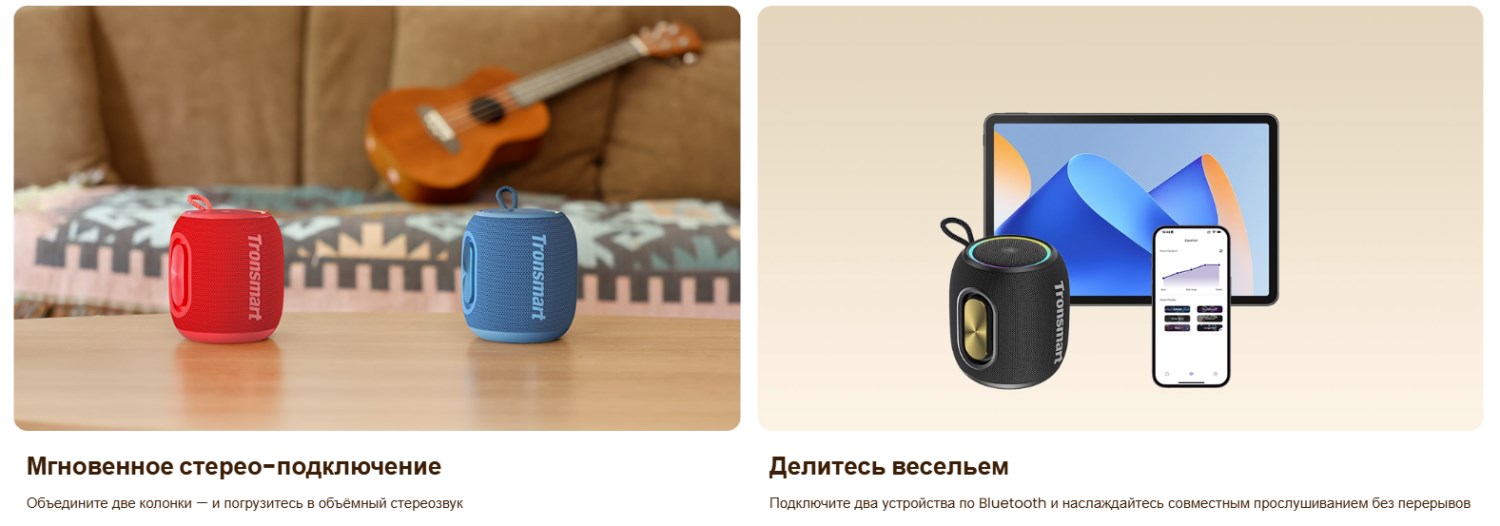 Как уже отмечалось, Tronsmart T8 Mini – это улучшенная по всем параметрам модель T7 Mini. Немного увеличилась мощность, появилась возможность одновременного использования пары таких устройств, добавилась возможность использования эквалайзера через приложение. Также к одной колонке можно подключить через Bluetooth два устройства, например, смартфон и ноутбук. Ещё улучшилась влагозащита, теперь она соответствует стандарту IPX7. Всё это вместе обеспечивает очень заметные изменения. Плюсом также является возможность установки карт памяти и подключение внешнего источника через 3.5 мм джек.
