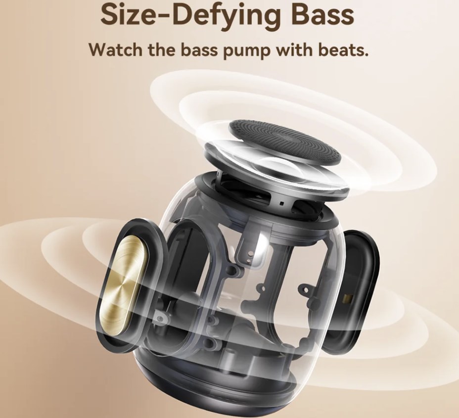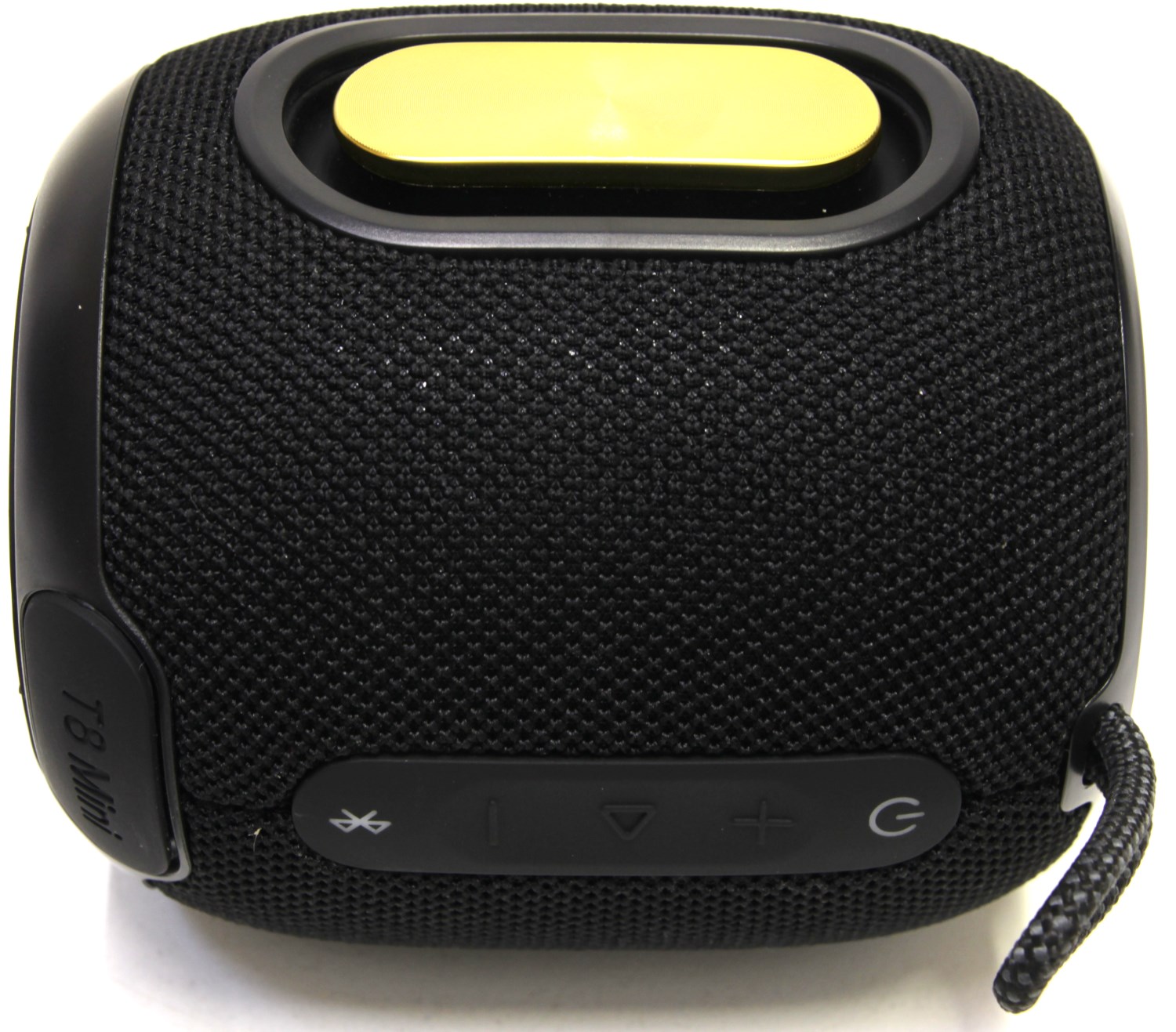 Подключение осуществляется по Bluetooth, качество соединения хорошее. Уверенный приём где-то 5 м в прямой видимости. Через стены тоже работает, но без фанатизма. Устройство внешне напоминает маленький бочонок со шнурком. Динамик расположен сверху, а два пассивных излучателя низких частот по бокам. На последних есть заметные золотые вставки. Шнур очень прочный и устройство можно за него носить или куда-то подвесить.