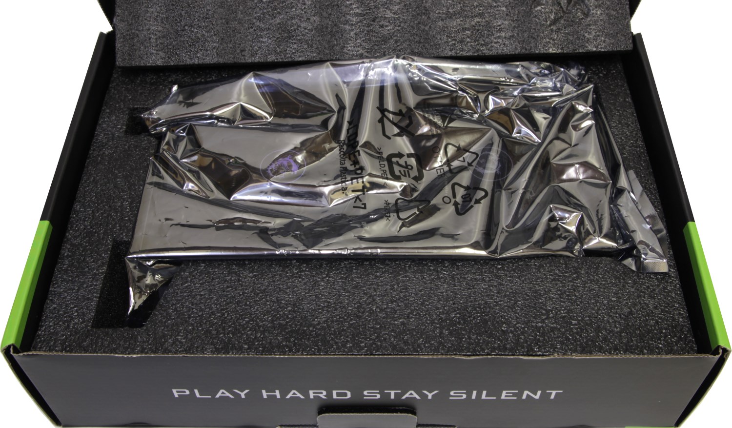В нём и ещё дополнительно в антистатическом пакете зажата видеокарта. Комплекта поставки тут нет, только инструкция, которая скрывается на самом дне упаковки под видеокартой в небольшом углублении.