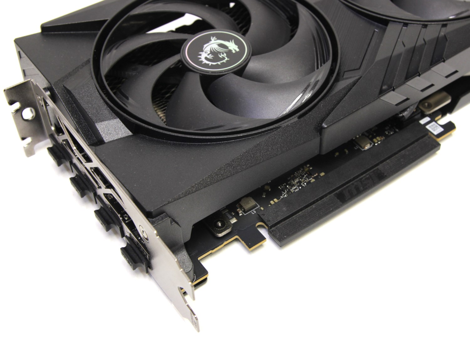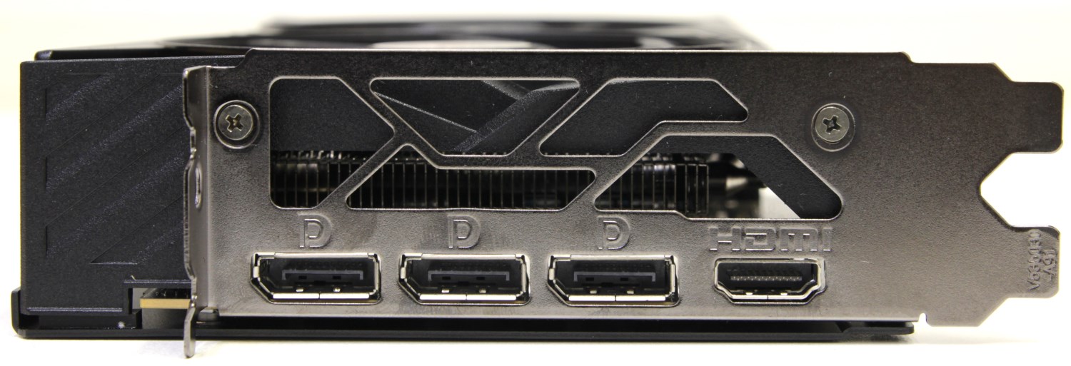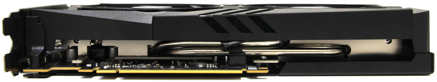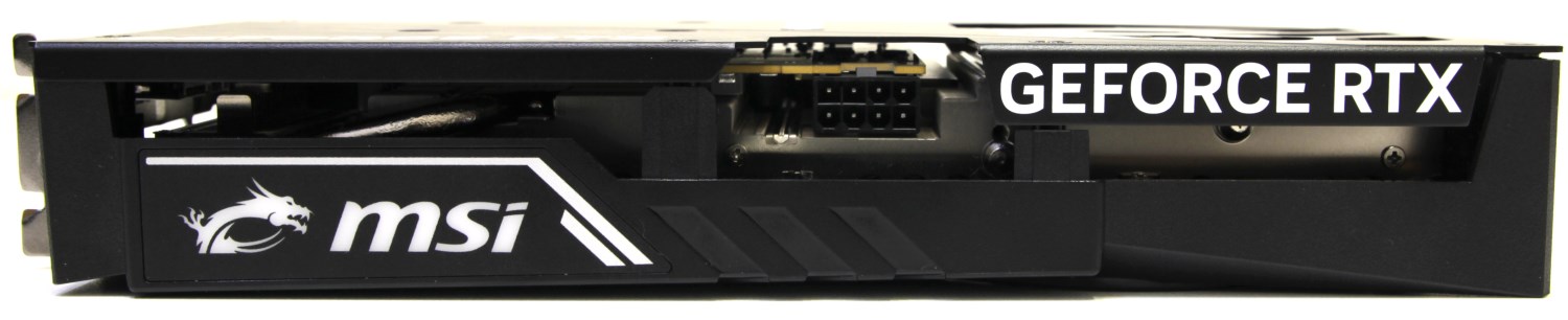 Кроме того, на ней заметны крупные прорези для того, чтобы воздух проходил радиатор насквозь свободно. Это свидетельствует о том, что сама печатная плата короткая и меньше участвует в распределении тепла. В центре этих отверстий находится огромный логотип MSI Gaming, но без подсветки.