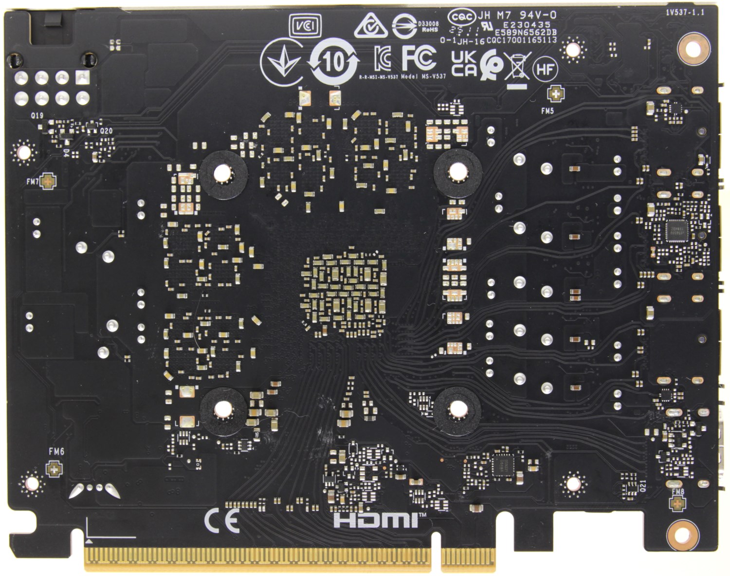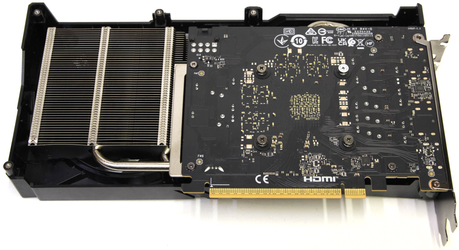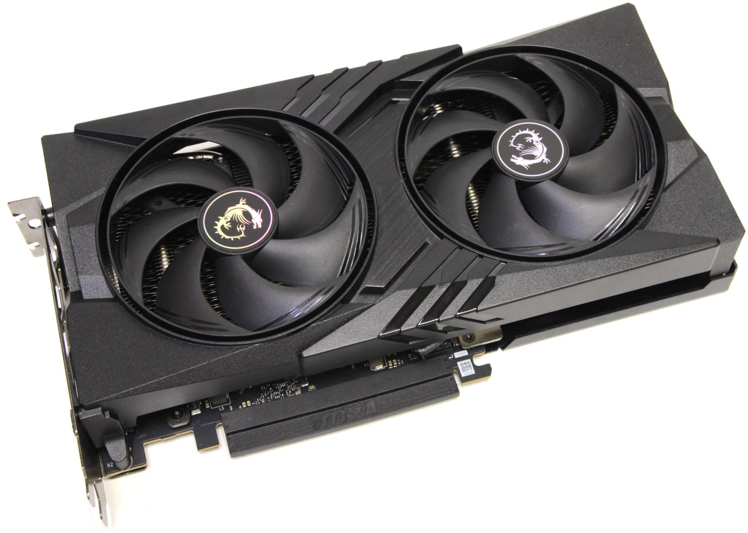 Кроме того, на ней заметны крупные прорези для того, чтобы воздух проходил радиатор насквозь свободно. Это свидетельствует о том, что сама печатная плата короткая и меньше участвует в распределении тепла. В центре этих отверстий находится огромный логотип MSI Gaming, но без подсветки.