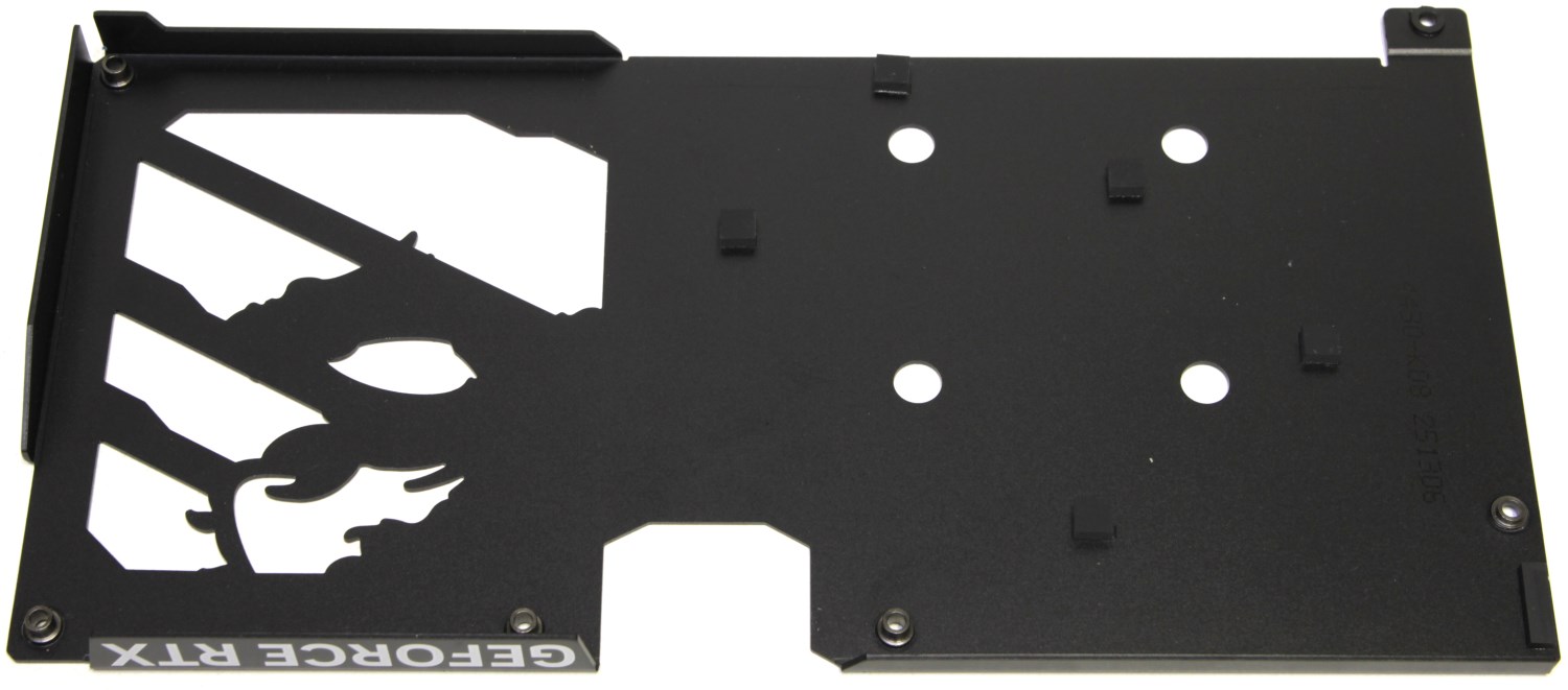 Сзади видеокарты мы снова видим защитную пластину (бэкплейт). В данном случае она выполняет скорее декоративную функцию, ведь термопрокладок, которые бы с ней контактировали, нет.