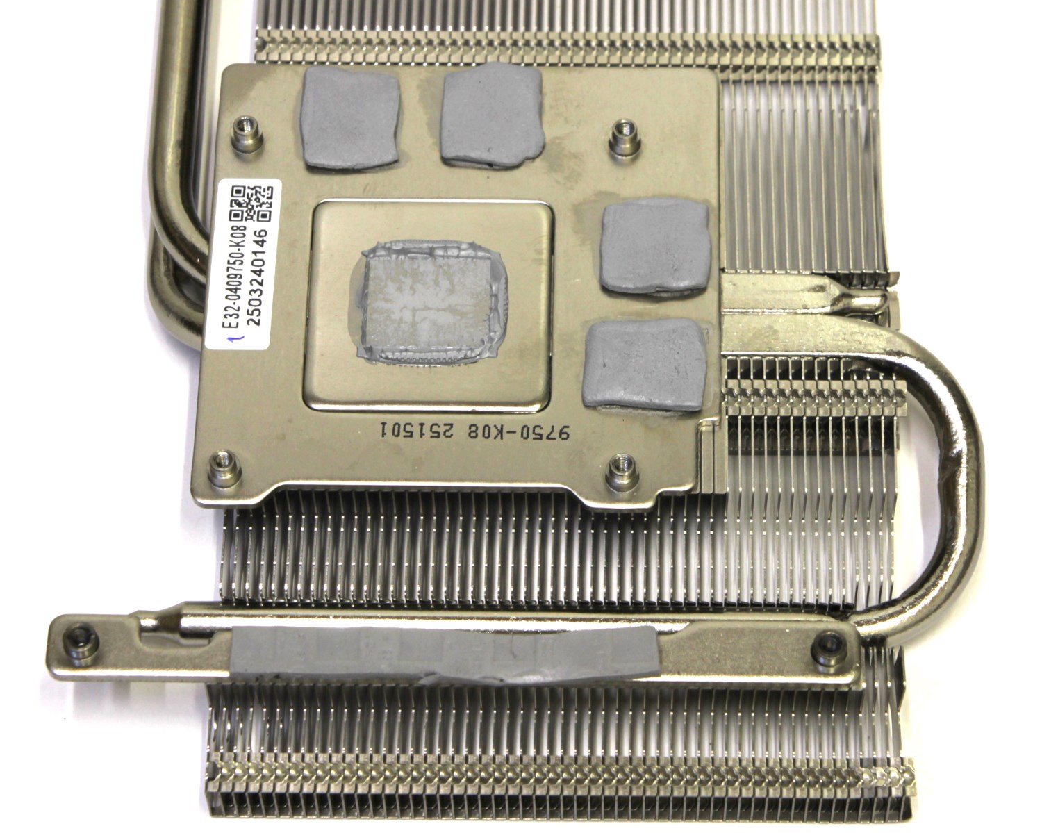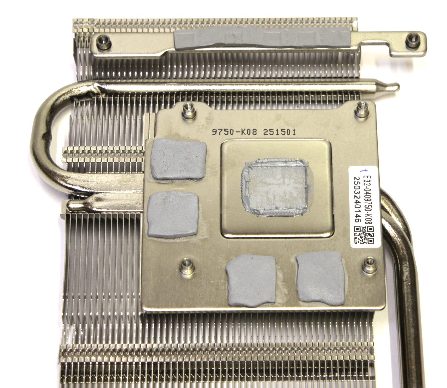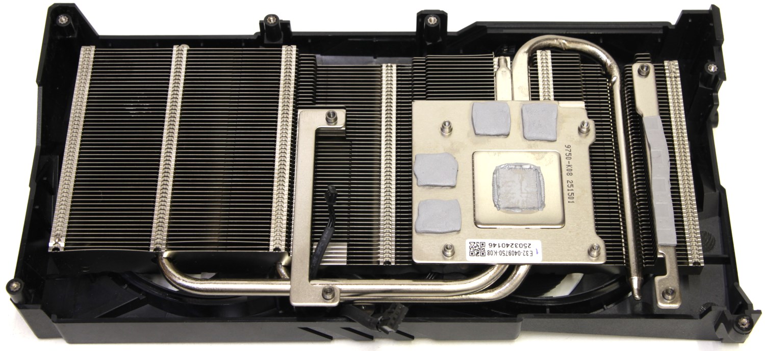 Сам кулер изготовлен по классической схеме. Одна секция и две тепловые трубки. Соответственно пластины тут расположены не перпендикулярно плате, а параллельно, в чём есть свои плюсы. За контакт с GPU отвечает обычная медная никелированная пластина. Графический процессор контактирует с ней напрямую через термопасту, а с микросхемами памяти через термопрокладки. Термоинтерфейс чипа достаточно твёрдый.