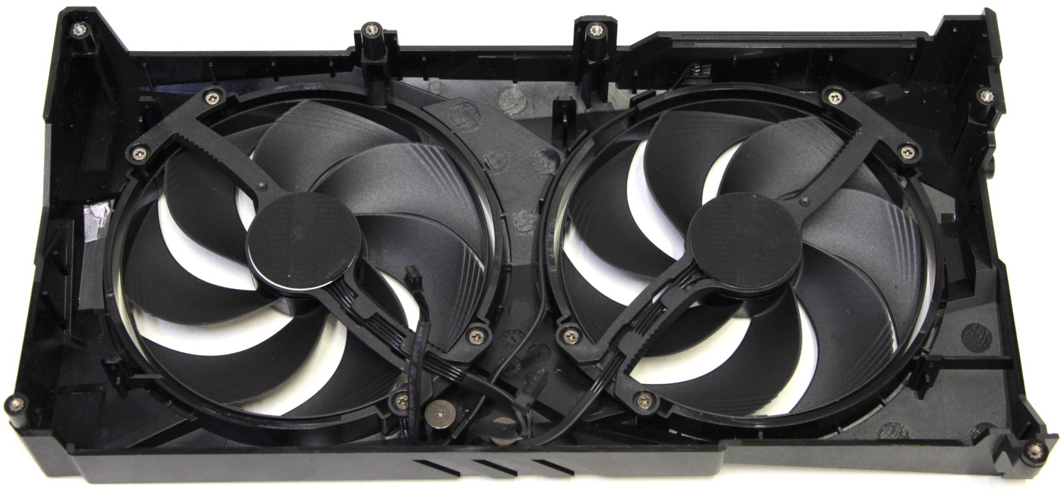 Пластиковый кожух чёрный с серыми вставками. Однако дизайн немного переработан. Он крепится четырьмя винтами к пластинам радиатора, для чего предусмотрены специальные пластиковые ушки. Оба вентилятора крепятся непосредственно к этому кожуху. С обратной стороны двигатели заклеены специальными мягкими наклейками, которые предотвращают передачу колебаний на радиатор.