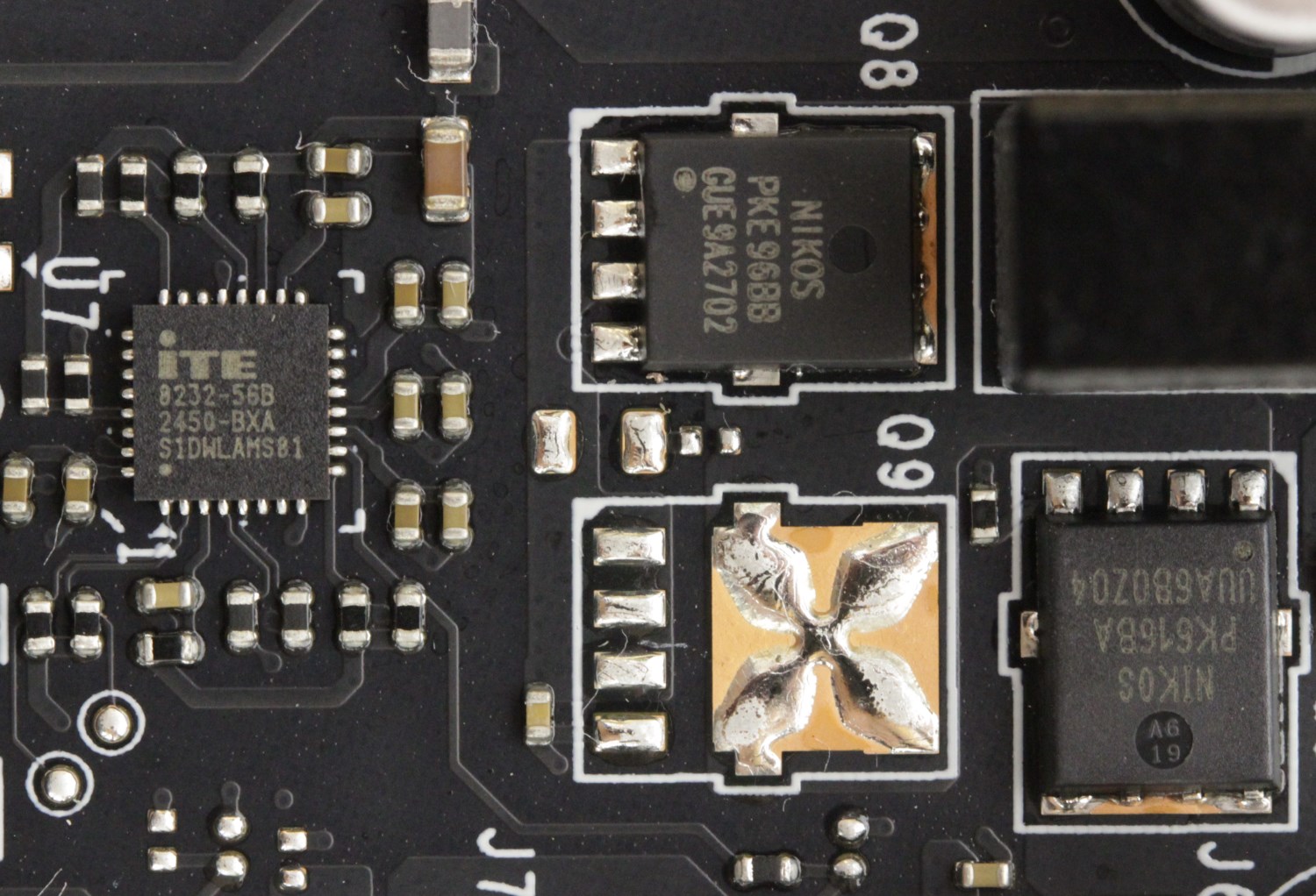 На каждую фазу приходится по одной транзисторной сборке AOZ5311NQI на 50 А и одной ферритовой катушке индуктивности.