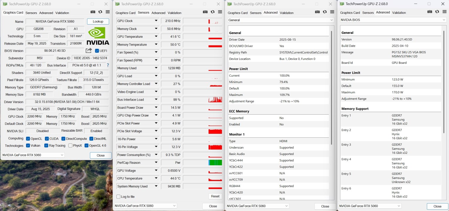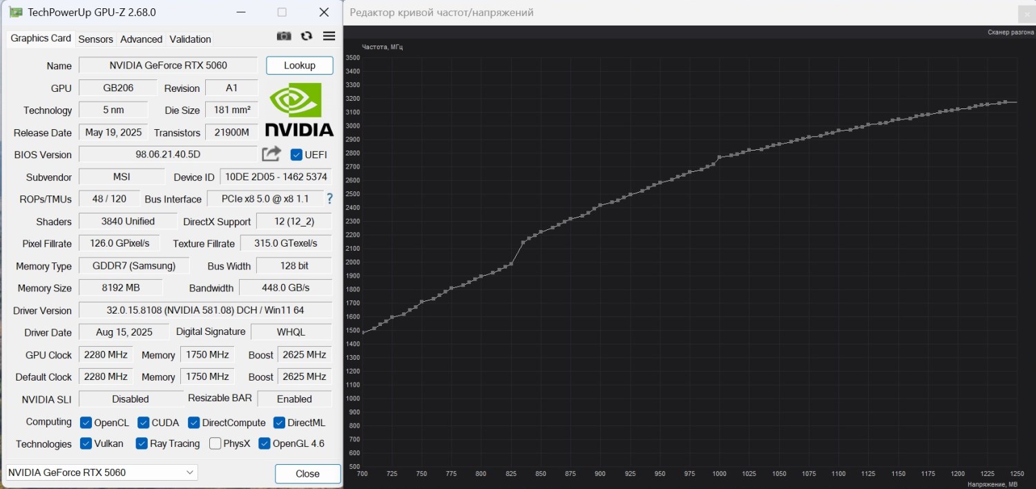 - Видеокарта: MSI GeForce RTX 5060 Gaming OC 8 Гбайт (2280 / 2625 / 1750 МГц (ядро/boost/память));