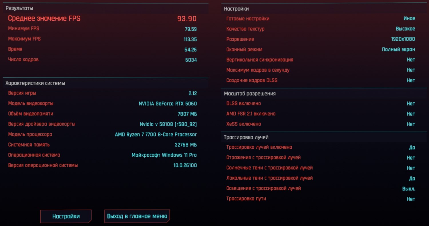 Cyberpunk 2077, FHD, трассировка минимальная, DLSS выкл.: