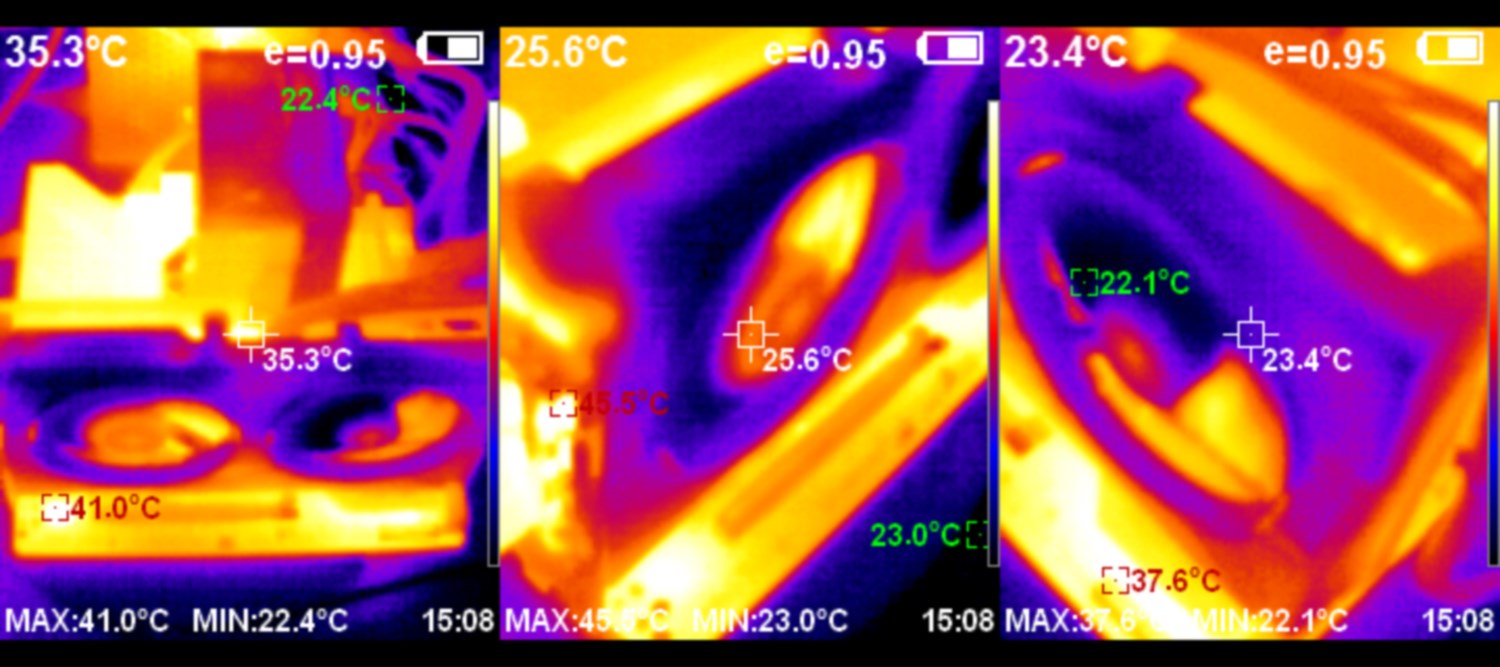 Посмотрим теперь на нагрев новинки во время интенсивной нагрузки. Особо высоких показателей температуры нет и это объясняется крупной системой охлаждения, которая обеспечивает низкую температуру и скромный уровень шума.