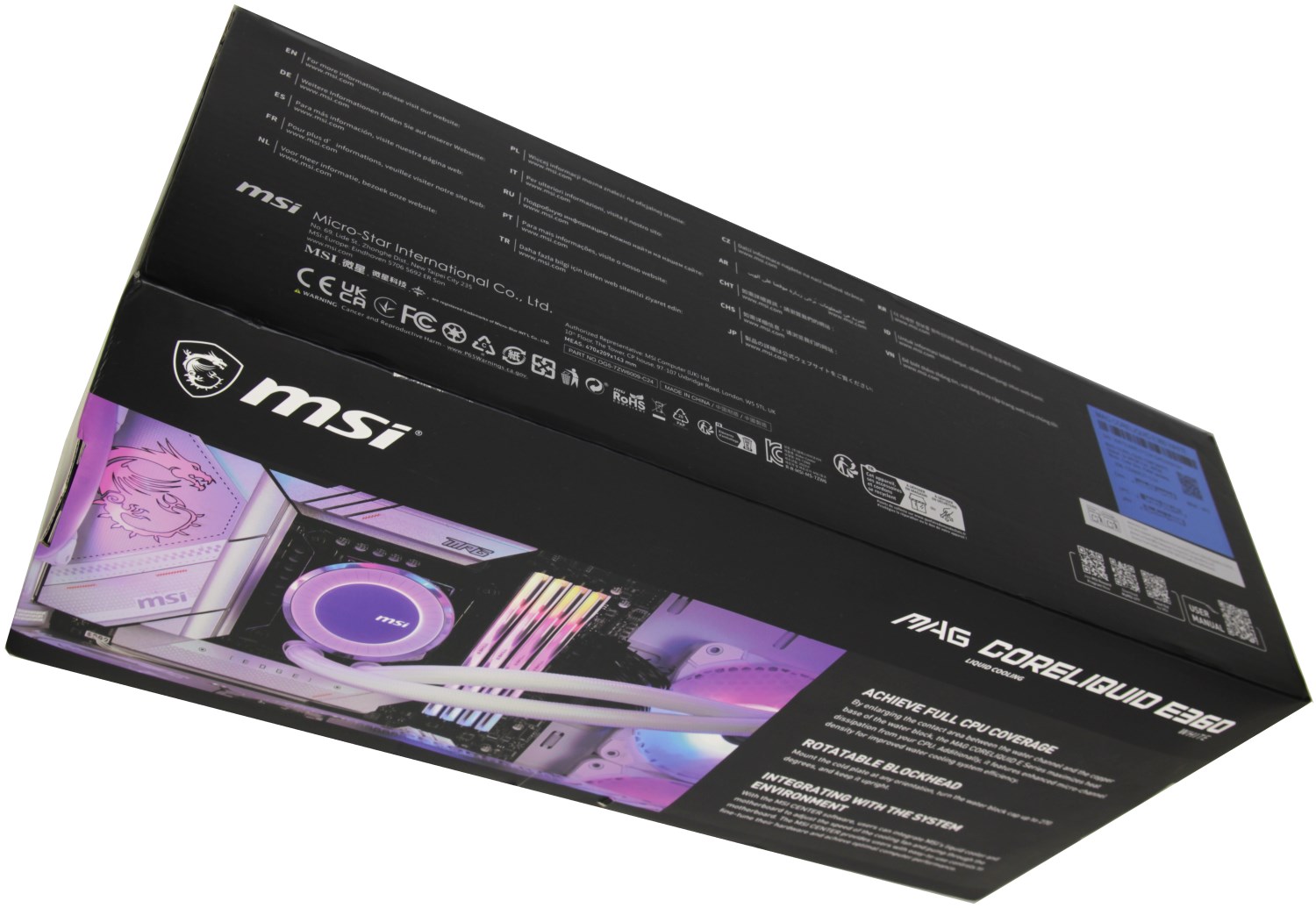 Внизу крупными символами обозначено наименование модели. Число 360 свидетельствует о том, что на радиатор устанавливается три вентилятора по 120 мм. Ниже указано, что это жидкостная система, а справа размещен новый яркий значок серии MAG.