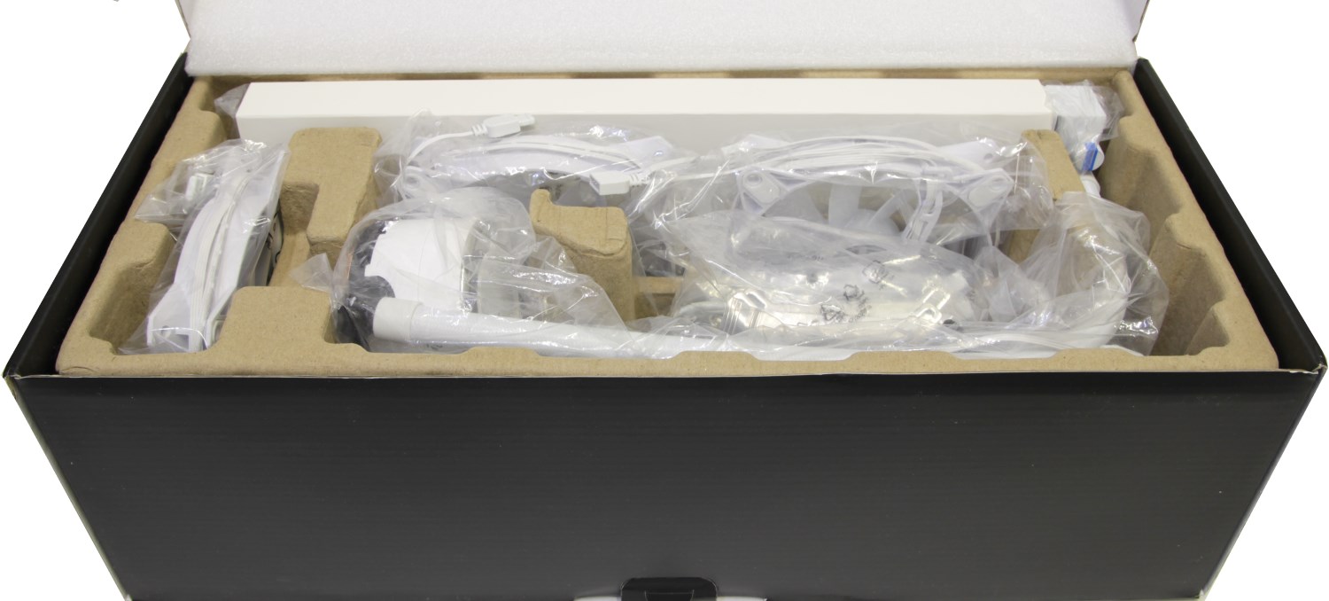 Далее видно, что всё аккуратно упаковано. По краям дугой огибается само устройство. Сверху находится радиатор, а внизу – водоблок с помпой. Соединяются они двумя шлангами. Посередине размещен остальной комплект поставки с двумя вентиляторами. А ещё есть инструкция и листовка.