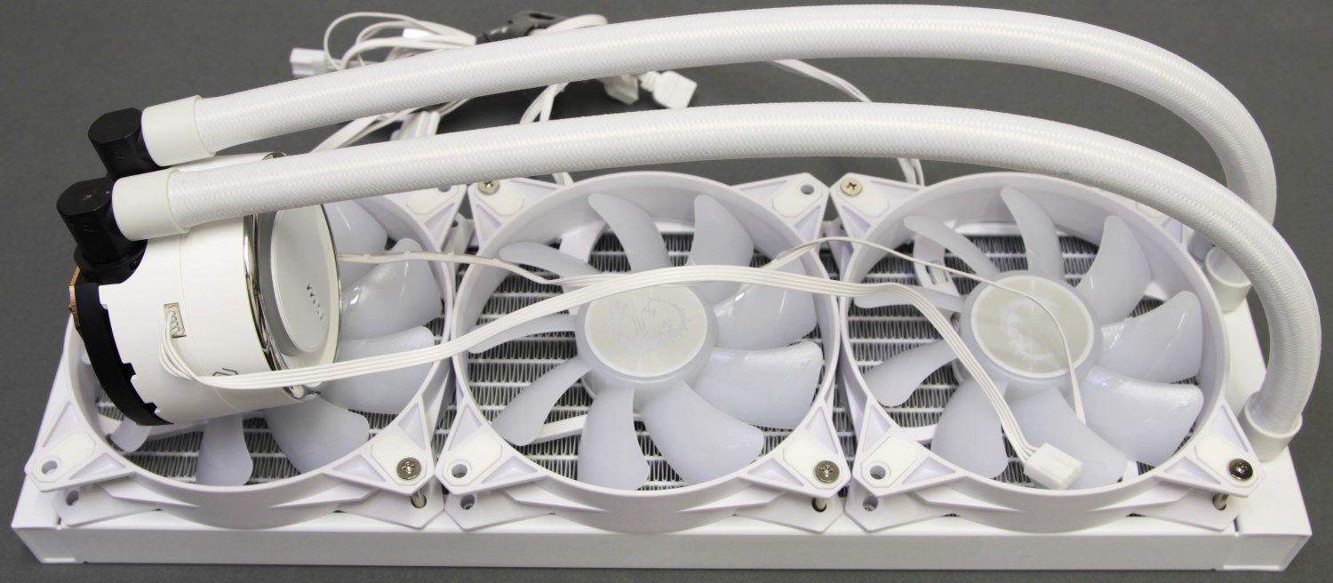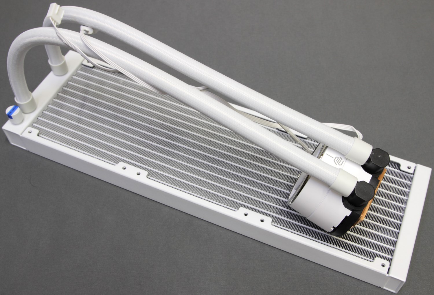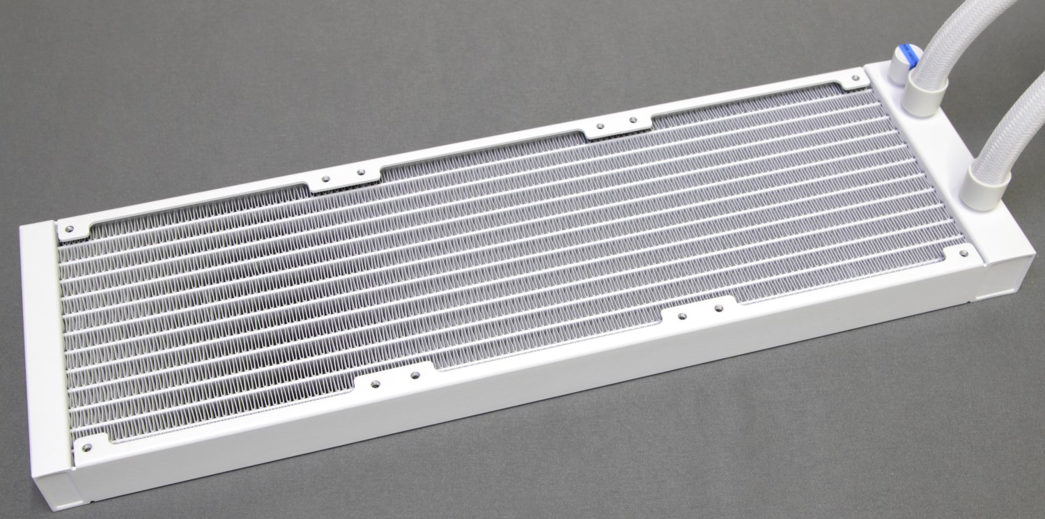 Про микроканалы остаётся только верить, ведь внутри мы ничего не можем узнать, иначе просто нужно разобрать водоблок. В остальном конструкция классическая: радиатор 360 мм, алюминиевый, тонкий и лёгкий. Он окрашен в белый цвет.