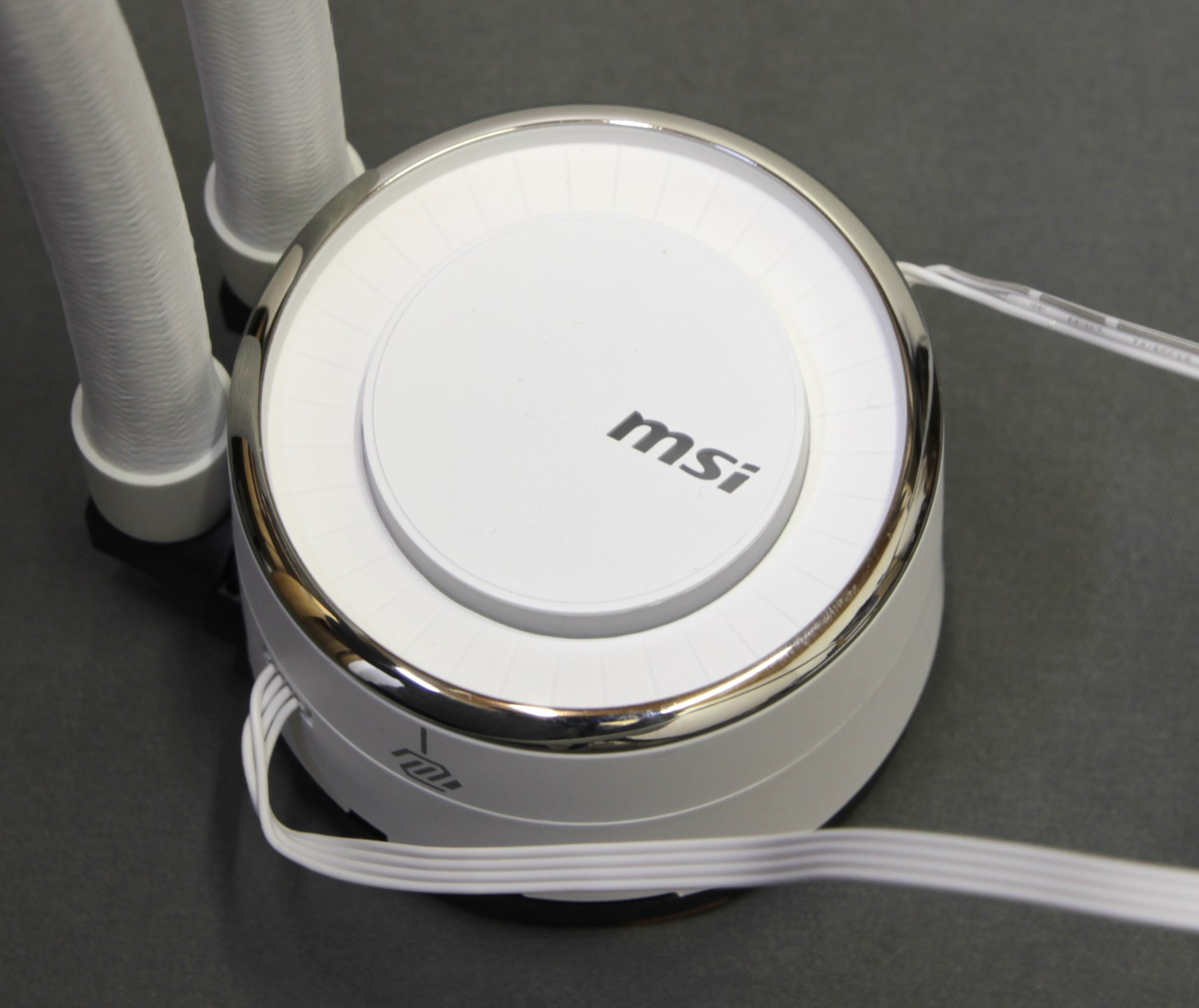 Сам водоблок заметно увеличен, о чём уже упоминалось ранее. Здесь вместе с ним в корпусе размещается помпа. Кстати, верхняя часть корпуса сделана поворотной, чтобы можно было вращать логотип компании MSI в центре.