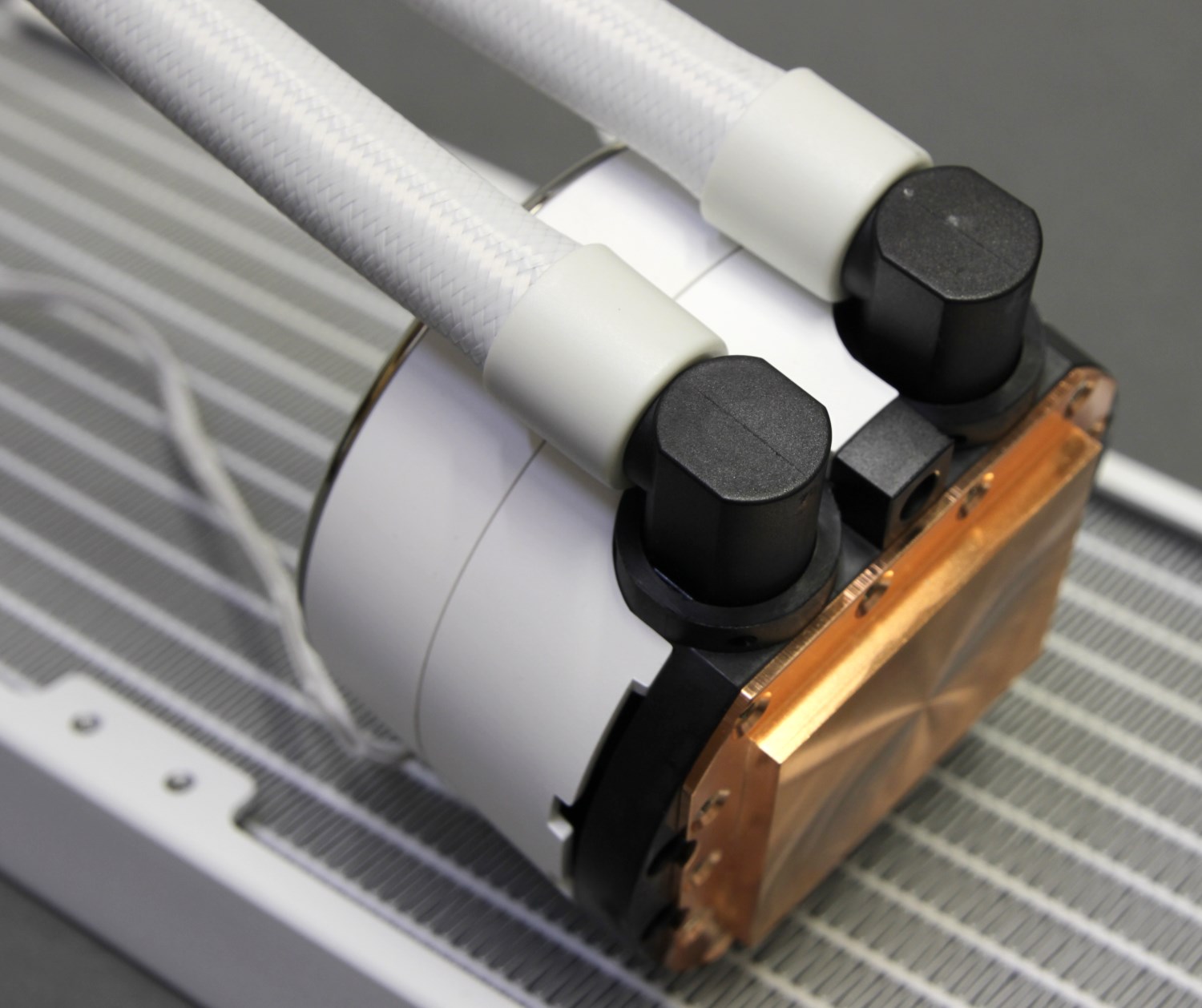 Из спецификации и описания можно было понять несколько простых вещей: используются вентиляторы со сниженной до 1800 об/мин максимальной скоростью вращения, изготовленные с использованием гидродинамических подшипников; помпа расположена в корпусе с водоблоком; применен водоблок с увеличенной площадью основания и микроканалов. Водоблок действительно другой, и это очевидно, достаточно лишь посмотреть на основание.
