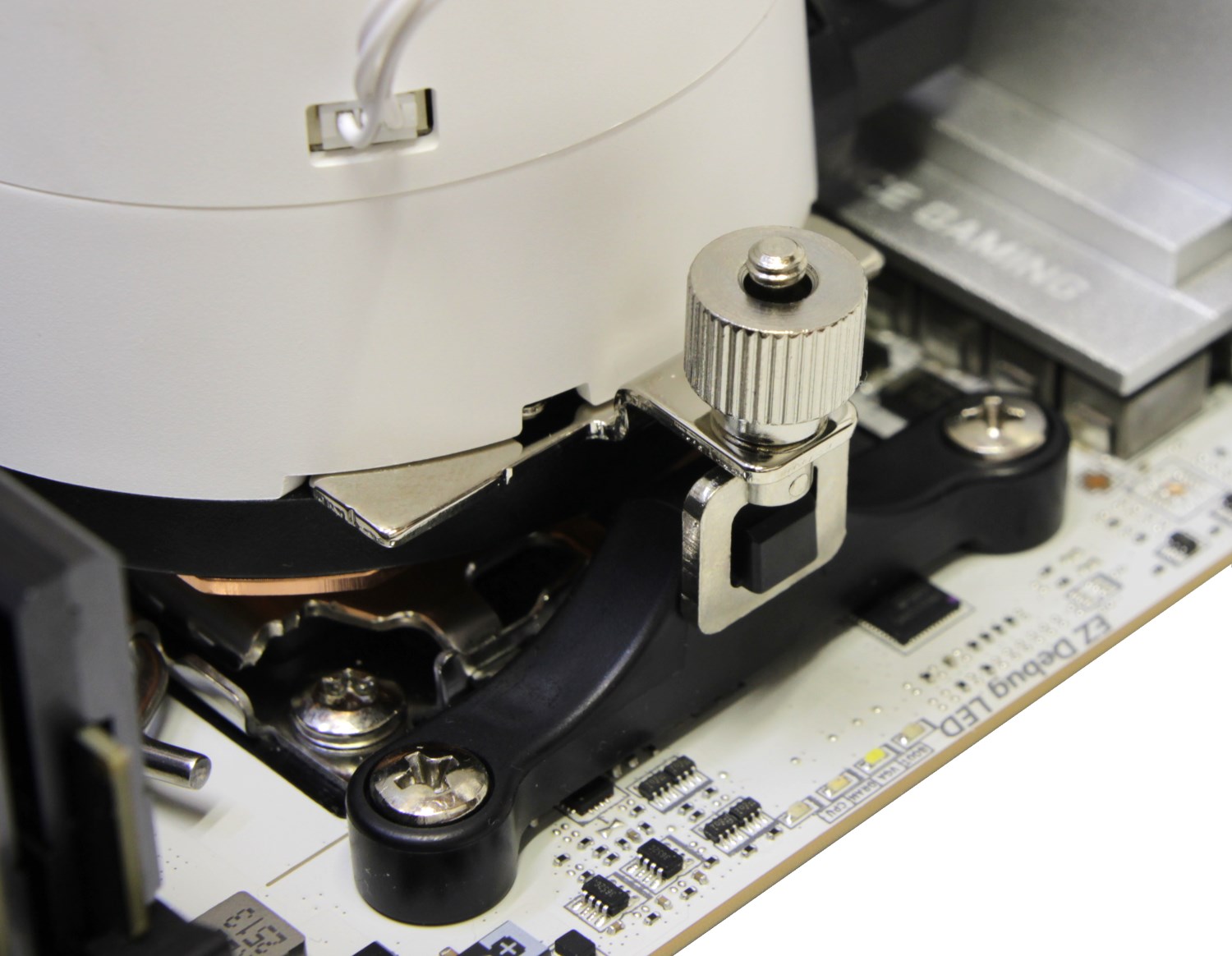 На AMD Socket AM5 всё устанавливается немного иначе. Для этого используется другой крепёж. В корпус таким же образом устанавливаются специальные адаптеры для крепления к штатным выступам пластиковых рамок. На адаптерах есть барашки, которые позволяют ослабить механизм, чтобы можно было попасть отверстиями за выступы, а потом уже затянуть и зафиксировать. Таким же образом регулируется прижим. В данном случае он хороший.