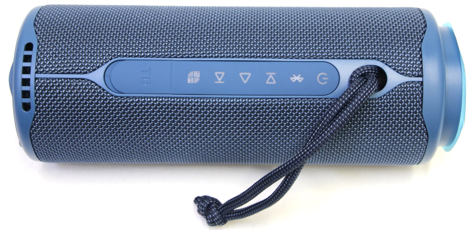 Что касается органов управления, то они также находятся сбоку. Там можно заметить шесть кнопок и небольшой отсек, закрытый резиновой заглушкой. Кнопки также закрыты резиновой панелью с символами. В некоторых из них скрыты светодиоды. Включение, Bluetooth сопряжение, трек назад, воспроизведение/пауза, трек вперёд, активация SoundPulse.