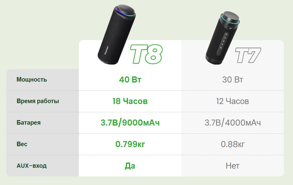 В целом характеристики выглядят неплохо. По сравнению с моделью T7 был добавлен разъём 3.5 мм AUX-in и увеличена ёмкость аккумулятора. Однако удивляет другое. Мощность увеличилась, защита стала лучше, ёмкость аккумулятора выше, а устройство стало легче.