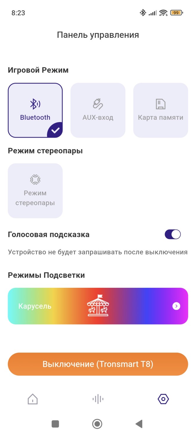 Также есть собственное приложение, где можно настраивать звучание. Для этого есть несколько предустановок и эквалайзер, который позволяет выделить группу частот. Приложение простое и понятное. Также здесь можно настроить один из трёх вариантов подсветки. Есть функция обновления прошивки и простое управление плеером, если используется карта памяти. Разумеется, можно регулировать громкость прямо со смартфона. Подключение осуществляется по Bluetooth, качество соединения хорошее. Уверенный приём где-то 3 м в прямой видимости. Через стены тоже работает, но без фанатизма. Через метровую бетонную стену сигнал не проходит, а через пару деревянных или гипсокартонных вполне. Ещё можно объединить пару таких устройств, чтобы добиться ещё более объёмного и мощного звучания.