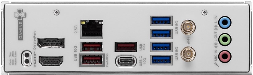 Заглушка разъёмов задней панели уже установлена на плате и крепится к боковому радиатору. Слотов расширения всего три. Только самый верхний PCI-e x16 Gen5. Он выделен стальной рамкой. Другой PCI-e x16 ограничен скоростью PCI-e x4 Gen4. Ещё есть один PCI-e x1 Gen3. Также тут выведено четыре SATA порта. Кстати, второй M.2 уже работает в режиме PCI-e x4 Gen4, что тоже неплохо, но охлаждения у него не предусмотрено, поэтому придётся использовать что-то своё, если накопитель будет горячий.
