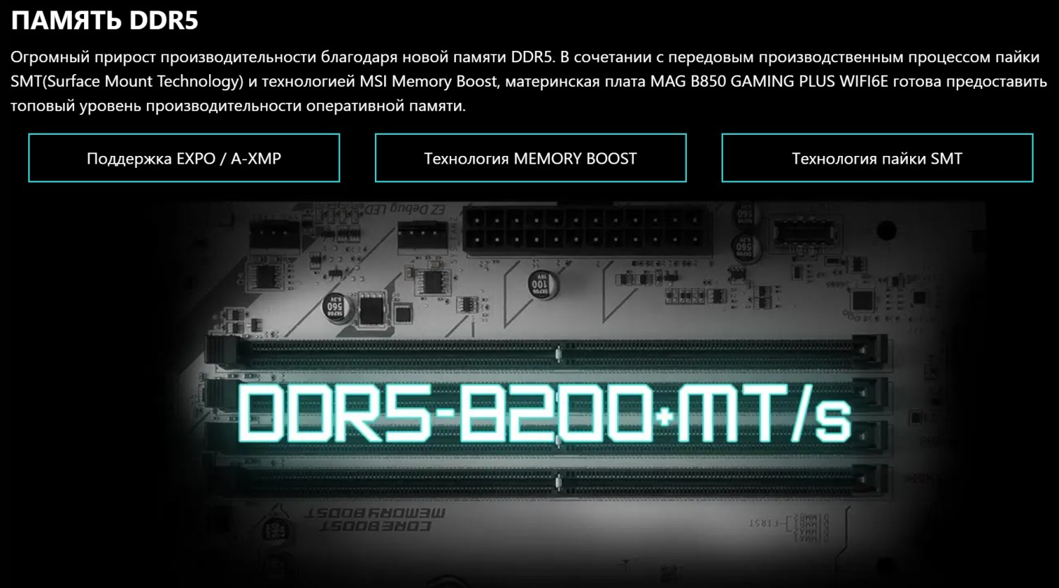 Поэтому, если устанавливать самое современное и быстрое «железо», то вариантов особо нет. Нужно искать плату на B650E или B850. MSI B850 Gaming Plus WIFI6E – это более серьёзная плата с хорошей подсистемой питания, которая потянет даже флагманские модели процессоров, а для охлаждения элементов используются сразу два радиатора и ещё тут два коннектора 8-pin для питания процессора. Как и на прошлой модели, тут шестислойная печатная плата и четыре слота для установки памяти. Исходя из всего этого, две тысячи рублей доплатить можно.