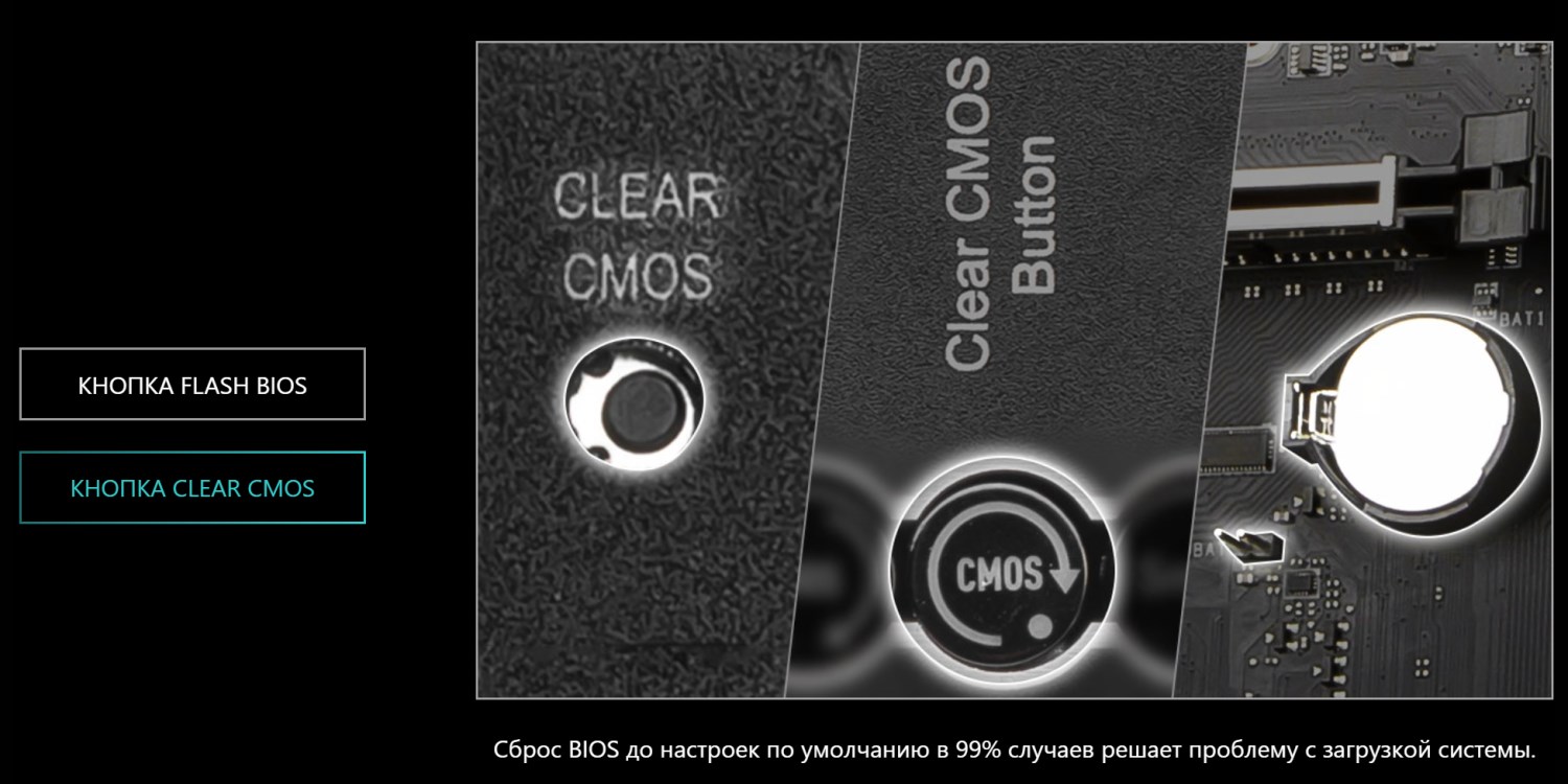 Для установки памяти тут предусмотрено четыре слота чёрного цвета. С одной стороны фиксаторы, а с другой – защёлки. Поддерживается режим работы до DDR5-8200, но не стоит забывать, что это разгон и никакой гарантии никто не даёт. Если что-то пошло не так, на задней панели есть кнопка для сброса настроек. Там же расположена другая кнопка, которая позволяет обновить BIOS c USB накопителя.
