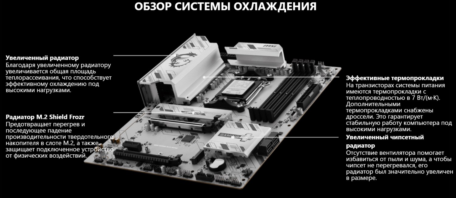 Тут действительно добавилось несколько радиаторов. Например, один размещен сбоку и отводит тепло от основной части транзисторов. Верхняя группа остаётся без внимания, но там всего две фазы. Ещё один радиатор устанавливается на верхний накопитель M.2. Такие устройства бывают достаточно горячие даже при подключении PCI-e x4 Gen4. Здесь используется быстросъёмный механизм. Последний радиатор отводит тепло от чипсета.