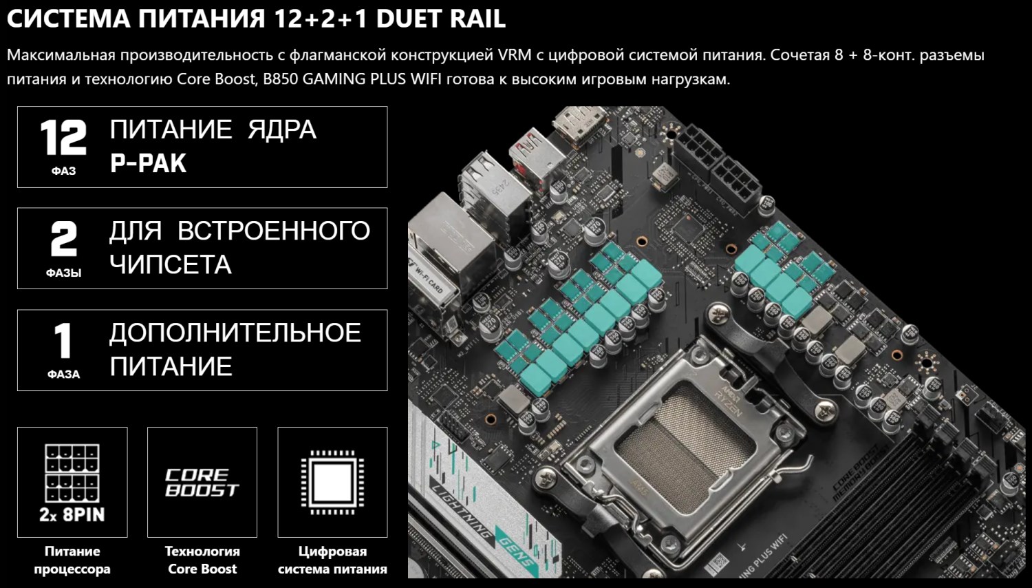 Чипсет AMD B850, но всем известно, что сегодня – это просто южный мост с поддержкой периферийных контроллеров. Соответственно он сам по себе мало на что влияет. Контроллер шины PCI-e 5.0 находится в процессоре, если он там вообще есть. Ведь существуют такие интересные модели, как AMD Ryzen 8000G. Радостный пользователь его покупает вместе с такой платой, а потом выясняется, что PCI-e 5.0 не работает. Ответ пытаются найти уже позже на форумах или даже в двух книгах: «Кто виноват?» и «Что делать?», но он прост – нужно сперва изучить спецификацию не только материнской платы, но и процессора.