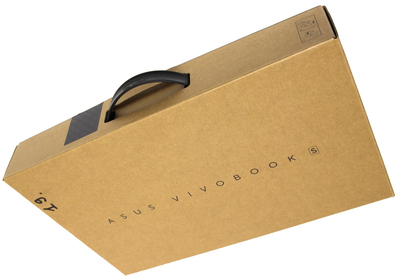 Оформление традиционно лаконичное. С одной стороны просто написано ASUS VivoBook S. На другой поверхности есть только стандартное предупреждение об аккумуляторах и наклейка с указанием модели и комплектации, а также штрих-коды и служебная информация.