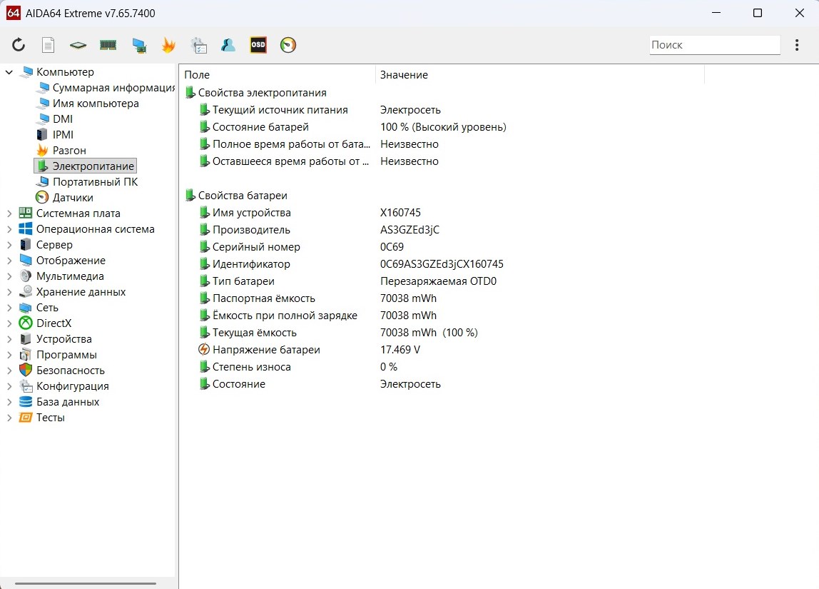 В комплекте поставляется зарядка на 65 Вт. Блок питания универсальный и максимально обеспечивает 20 В, 3.25 А, что как раз соответствует 65 Вт. Он с привычным уже USB Type-C разъёмом. За полчаса можно зарядить устройство на 36%, а полная зарядка занимает почти 2 часа.