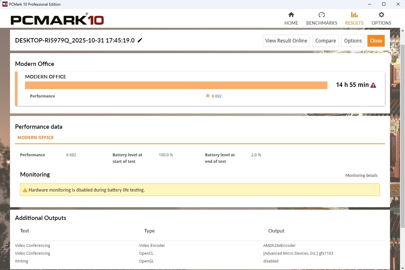 Работать в офисных задачах от аккумулятора можно достаточно долго, но в пределах разумного. Тестовый пакет PCMark с предустановкой Modern Office работает 14 часов 55 минут. Мне кажется, это отличный результат. Тут всё проходило без читерства.