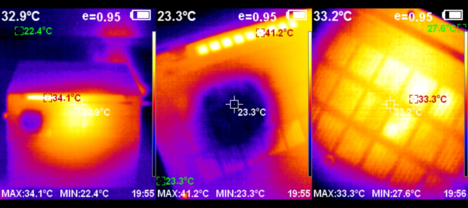 Нагрев устройства достаточно умеренный. При использовании тяжёлых приложений, Prime95 и Furmark, температура клавиатуры не поднимается выше 37°C. Можно заметить, что нагрев не равномерный, основная часть горячего воздуха выходит в месте его выхлопа.